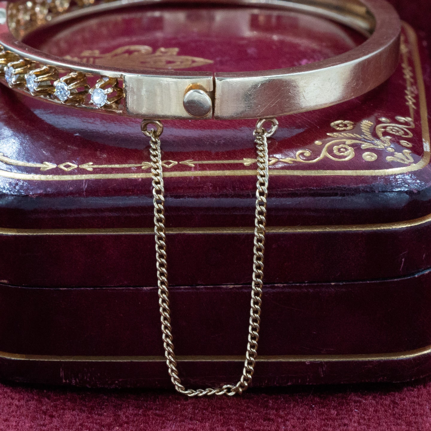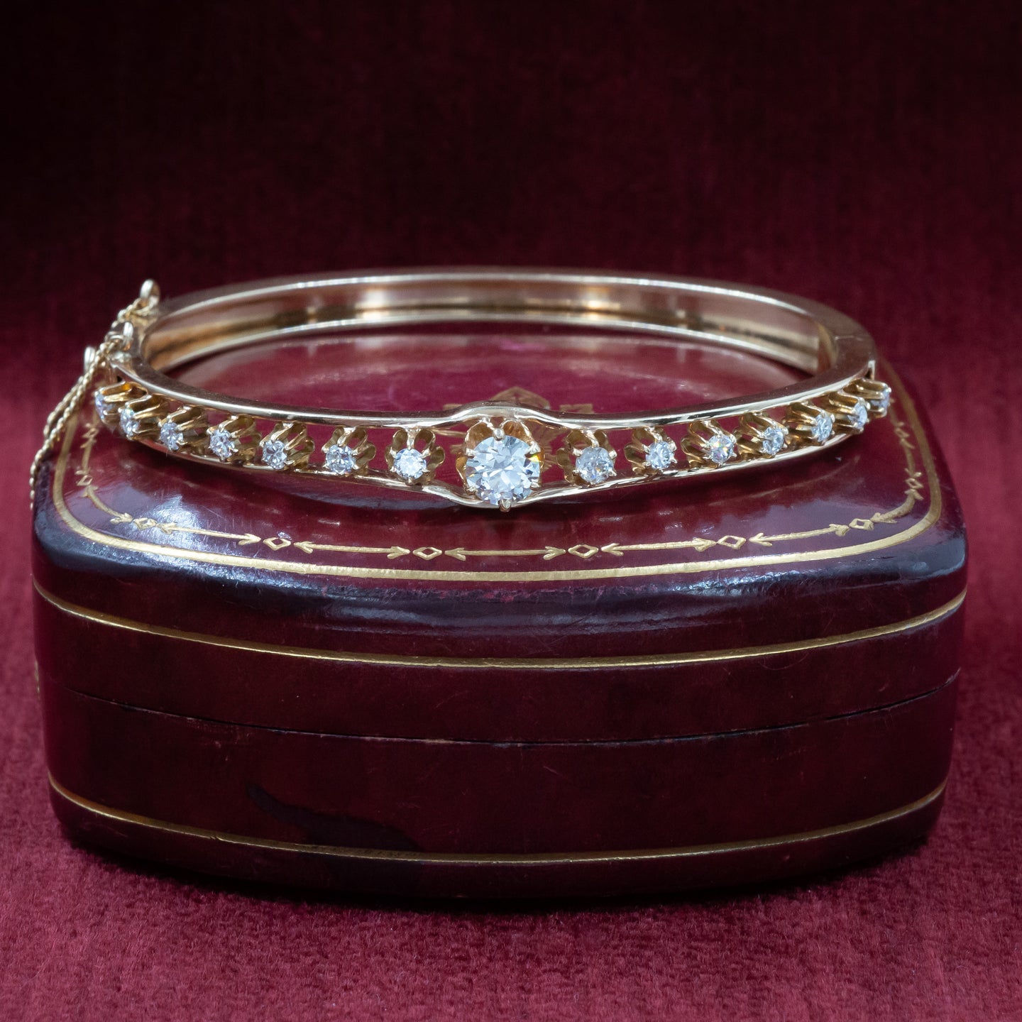 Antique cut diamonds dazzle in this stunning gold bangle from the 1930s! The fifteen transitional cut diamonds span across the entire top of this gorgeous bangle, all elegantly and evenly spaced so that each is distinct with its own radiant sparkle. Standing out in the center is the largest diamond, weighing about .85 carat and finely matched with the near colorless, evenly-sized diamonds that flank either side. Each stone is beautifully set in six straight prongs that rise from the bangle's open channel, allowing light to flow freely around the elevated diamonds as it dances with each and every facet in a brilliant show of fiery glitter. The base of the prongs gently curve and create a buttercup effect as they float like lotus flowers in a single stream, embraced by the open channel's walls on either side. This bangle is timeless for its simplicity, yet exudes antique charm through the distinctive sparkle of its diamonds and stunning craftsmanship. Enchanting on its own and easy to pair with other bracelets and jewels, this bangle is bound to be treasured in any collection!