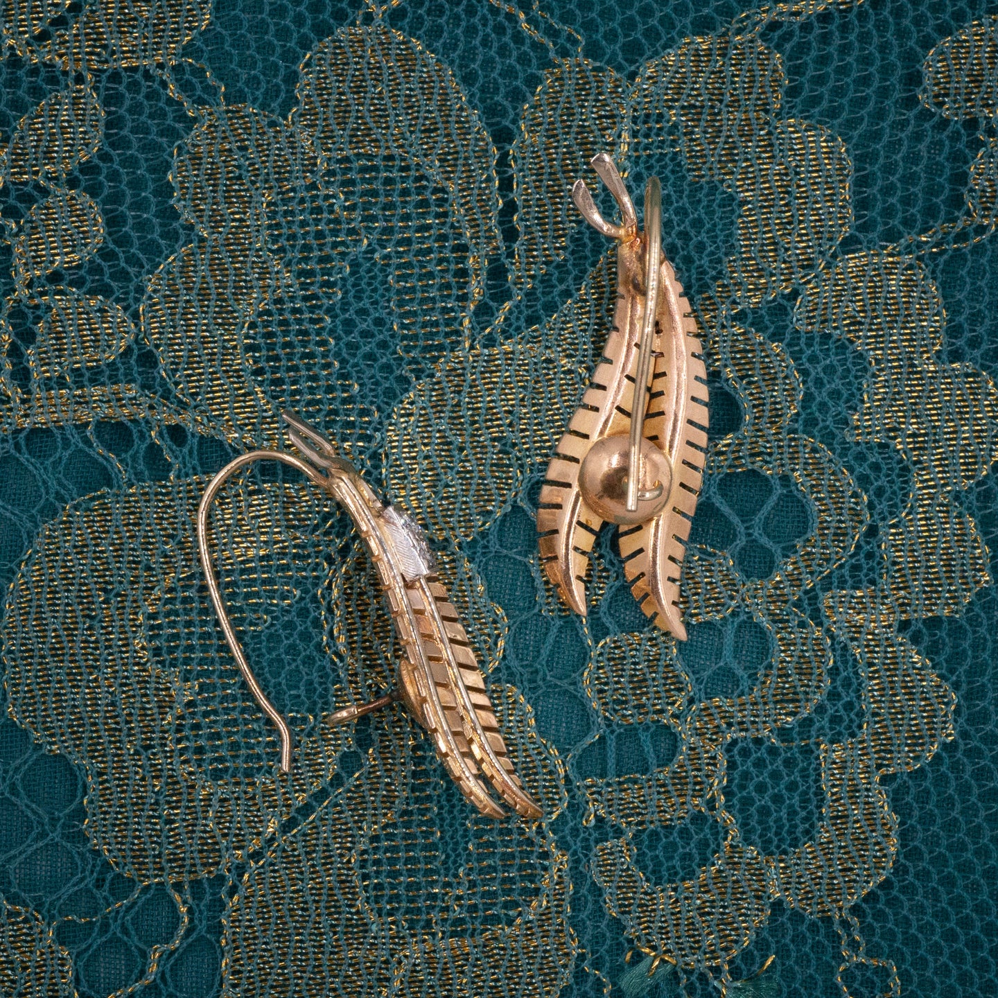 A darling pair of gold feathers softly hang in these charming midcentury earrings, beautifully framing a lovely face! Made in the 1950s and crafted in rich, warm yellow gold, this pair of earrings features two long feathers or fronds designed with striking detail. The elongated stems come together as they cross at the top where they are adorned with two sparkling full-cut diamonds set in white gold. The earrings are reminiscent of similar styles by Van Cleef & Arpels, among other high fashion jewelers that defined the era! Forever chic, these easy-to-wear earrings are readily a beloved addition to any jewelry collection!