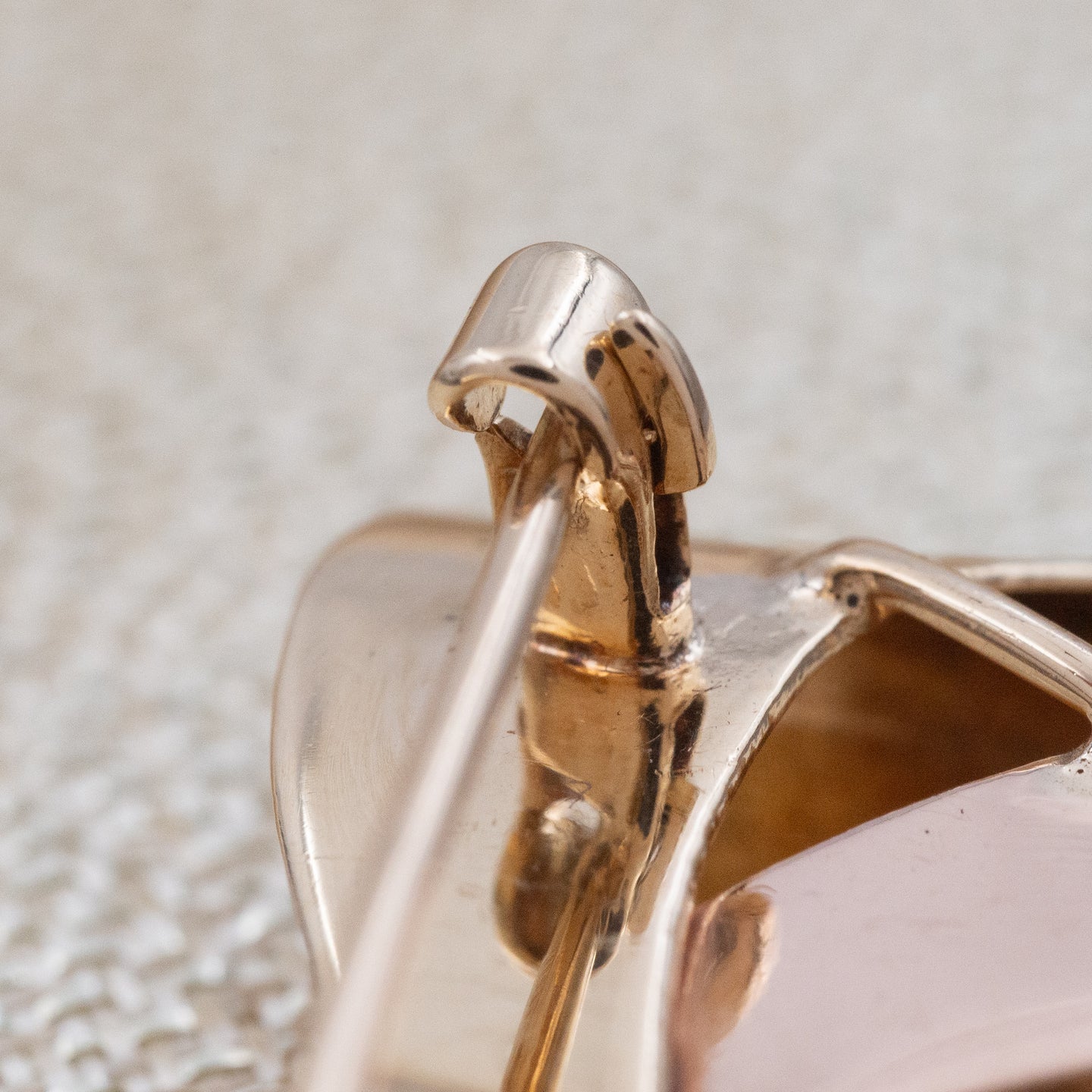 A rich goldenrod yellow citrine glistens at the center of this playful bow pin from the 1940s! True to the retro aesthetic of the period, this bow is askant and slightly asymmetrical, yet balanced with clean, highly polished ribbon-like gold in two tones, with half of it set in rose gold and the other half in yellow! The ribbon is flat and wide, ensuring that the gold goes a long way in creating a substantial piece without being heavy. This style became popular during WWII when fashion took a backseat to the war effort and many women went to work in uniforms. Oversized, playful jewelry designs were relied upon to bring levity and color to their ensembles. Decades later, this exemplary brooch continues to add a radiant whimsy to whatever it adorns!