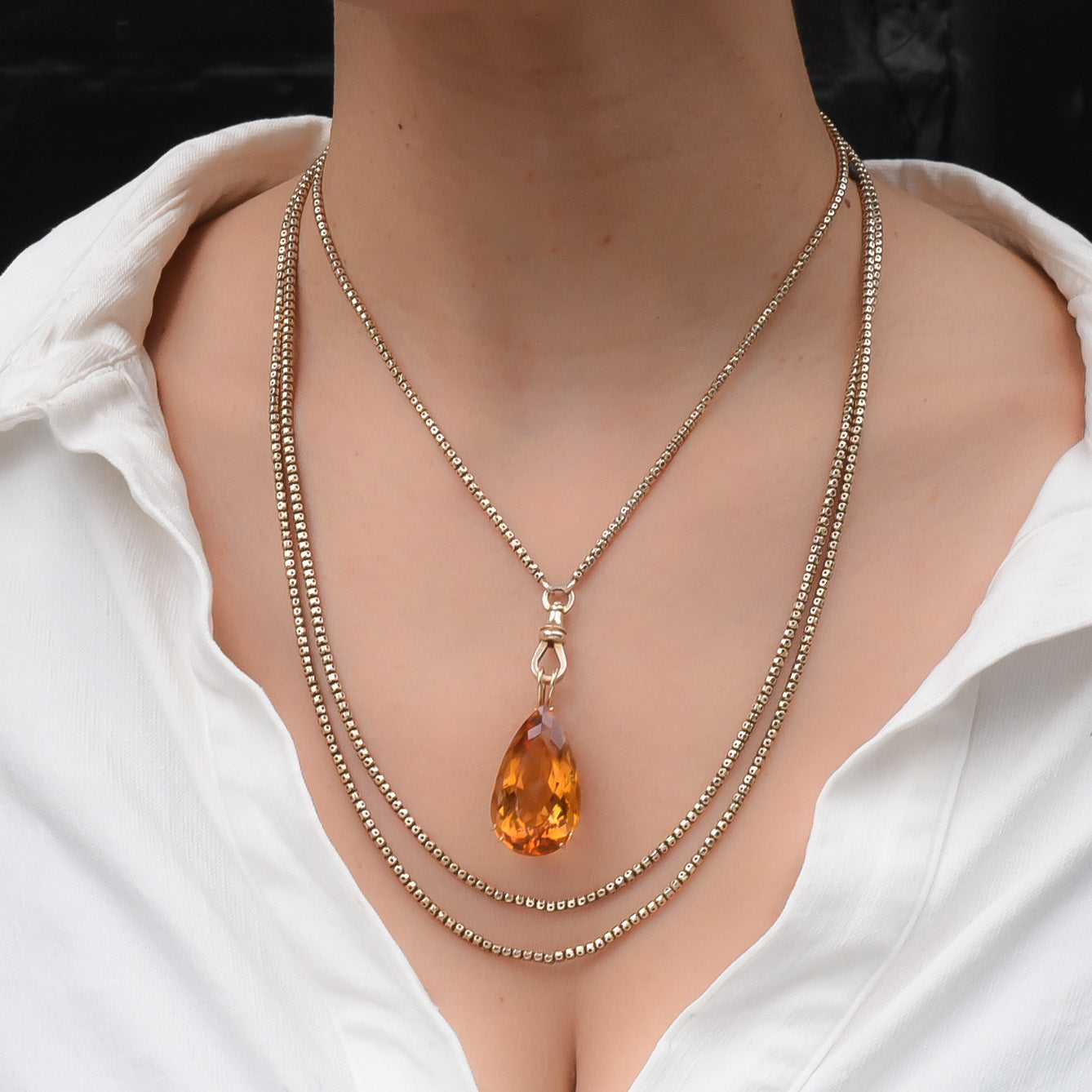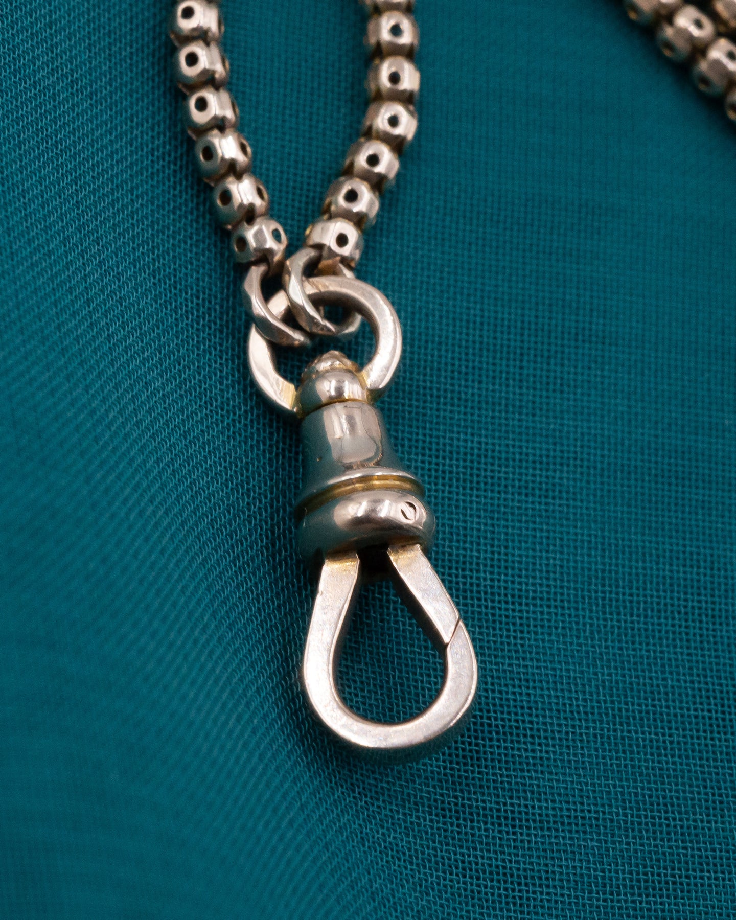 Handmade in the 19th century, the chain boasts a gorgeous antique patina and a satiny feel, smooth with no kinks, while its dependable box-style link is as beautiful as it is strong. While the chain has the construction of a box chain, the links are quite unique– each of their four sides is pierced in the center while its edges are cut like additional facets. Both the piercings and extra facets create a remarkable play of light, allowing the chain to glitter with every movement. The chain's versatile swiveling hook opens a world of possibilities for styling with pendants and charms. It's length allows it to be worn not only as one long chain as originally intended, but also looped twice or even three times around the neck, as modeled, to make a stunning statement necklace. Elegant and in excellent condition, this rare, extra long guard chain is simply everything you could wish for in an antique chain!