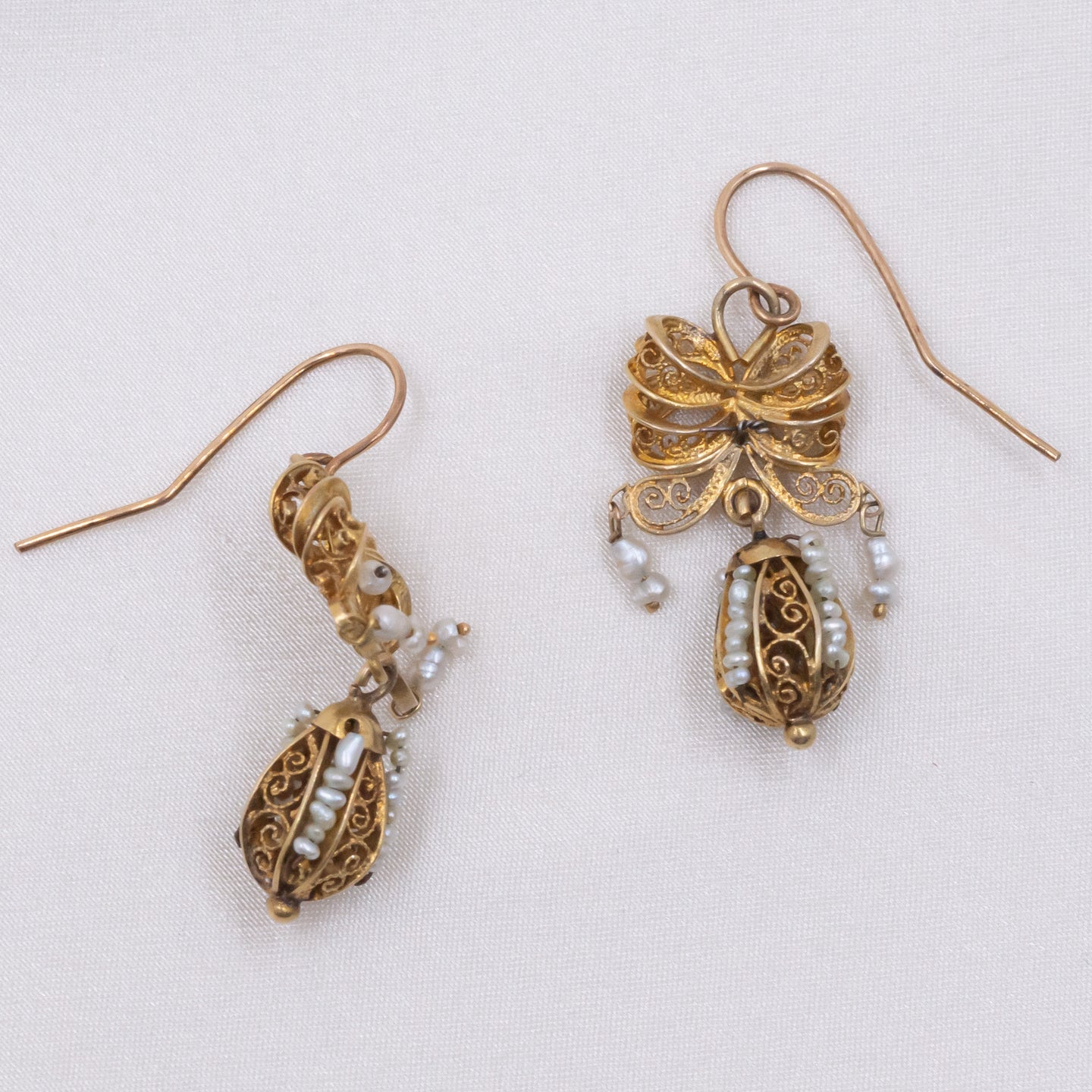 This feminine pair of earrings was carefully crafted by hand around the late 1800s from sturdy 10 karat yellow gold, boasting small natural pearls and exquisite wirework. Converted for pierced ears more recently, the tops tie up into flowing bows, while their dangling teardrop-shaped sphere provides the perfect balance as they dance freely with the wearer. The beauty of the lustrous natural pearls is perfectly complemented by the very fine filigree work seen all throughout the earring, made with thin wires of metal coiled into various scrolls and swirling shapes. They are lightweight, absolutely exquisite and heirloom-worthy - what else could one ask for? These antique earrings certainly have the right amount of elegant refinement for a variety of occasions, but they would make for an incredible final touch on a bridal ensemble!