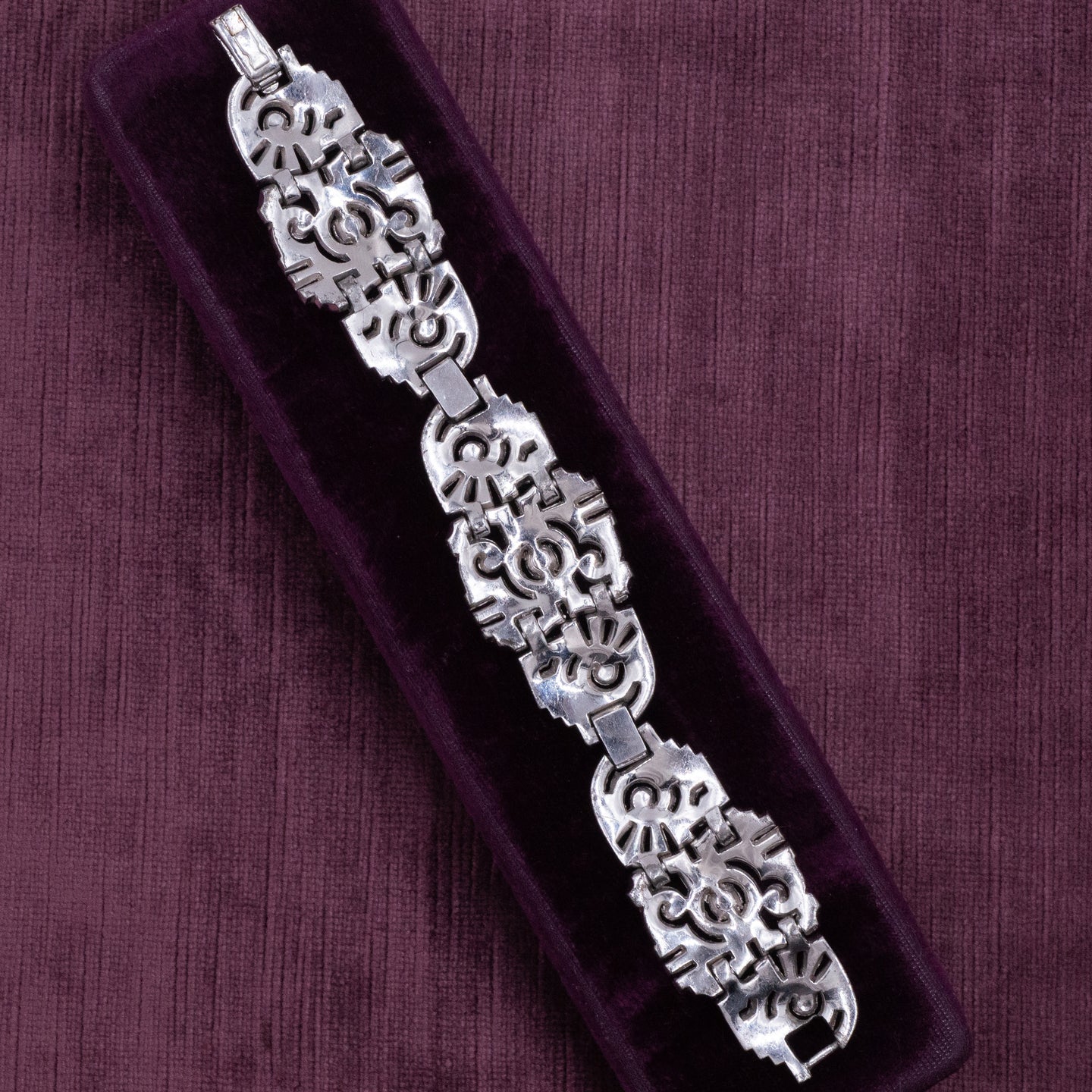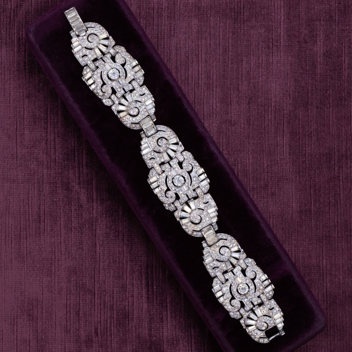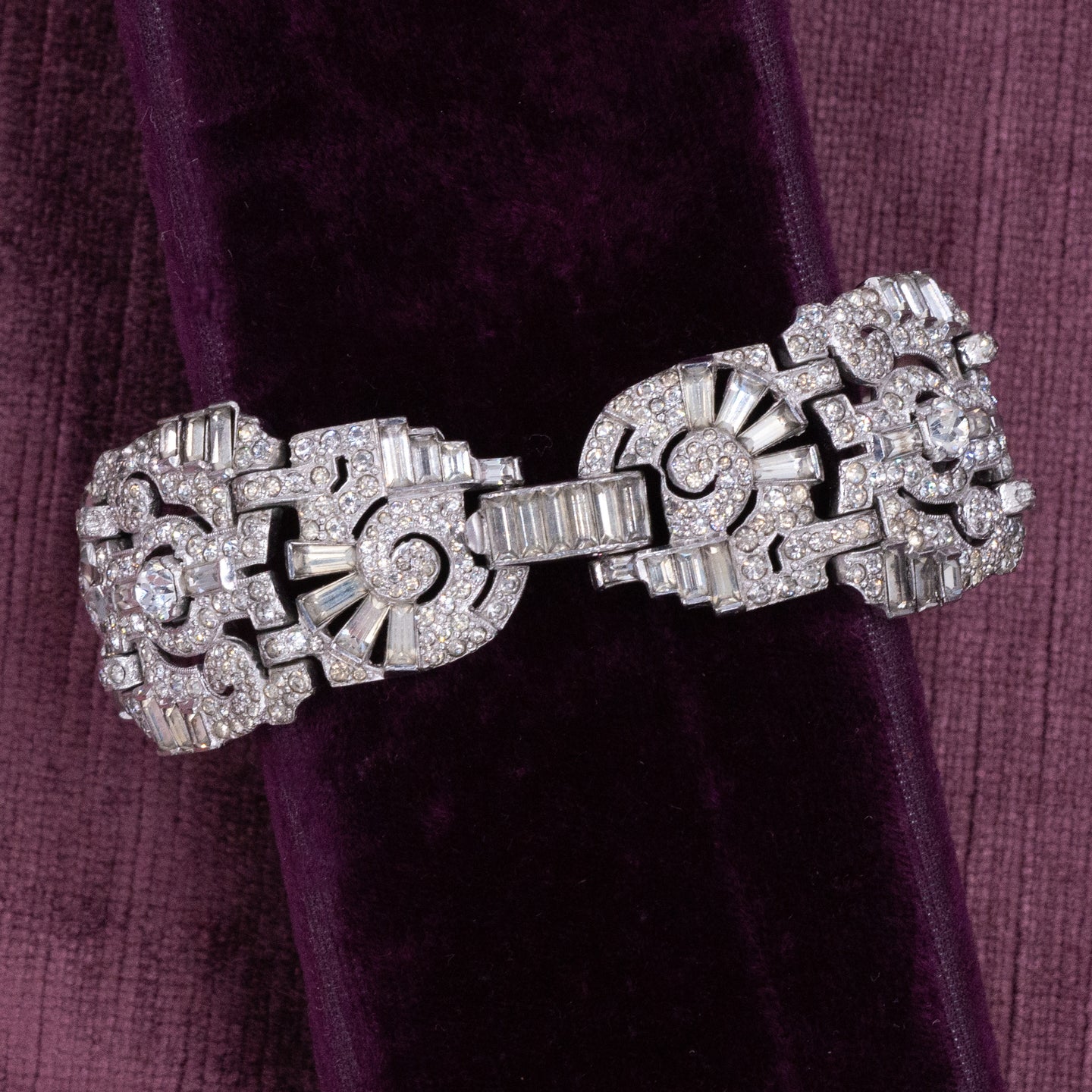 Stunning Art Deco details define this antique piece of costume jewelry from 'KTF', an early iteration of the famed Trifari brand! Made around 1930, this bracelet represents the beginning of a boom for Trifari as well as costume jewelry as a whole. Its design mimics the most intricate diamond and platinum examples of the era, and displays higher quality craftsmanship than we find in most fine jewelry today! The bracelet predates Trifari's widespread fame and recognition, and wearable pieces from this 'KTF' period are rare. The rhodium-plated metal remains bright, shining white while its numerous hand-set crystal rhinestones complete the bracelet, all intact in an array of sizes and cuts. Though a few of the stones are discolored, most glitter with all the brilliance they were set with, allowing for a fine example of Trifari's earliest work, nearly a century later!