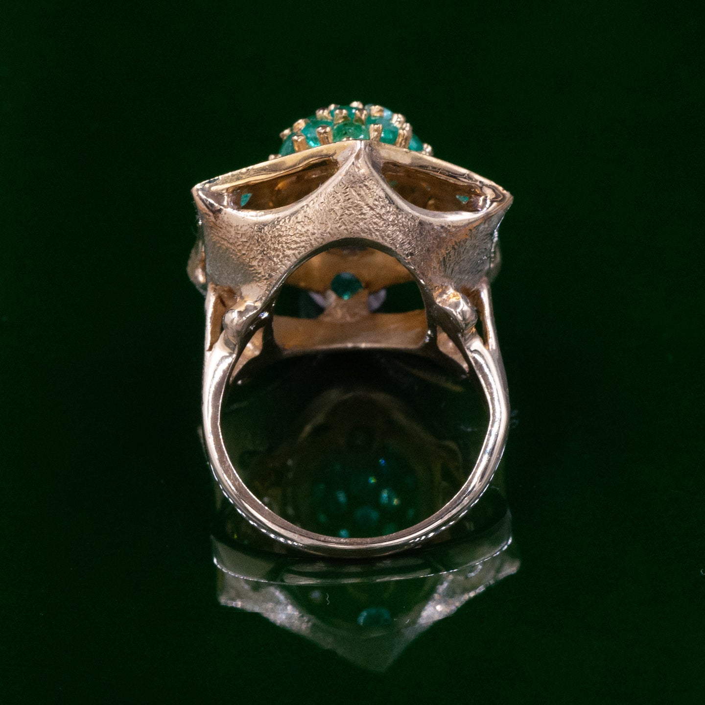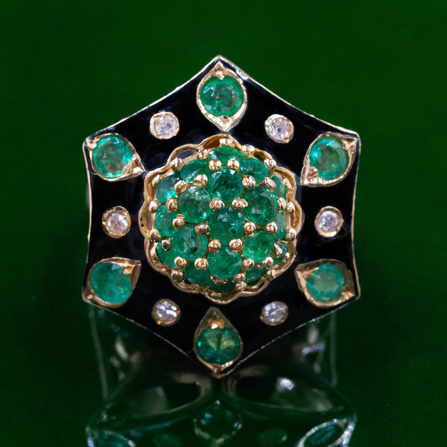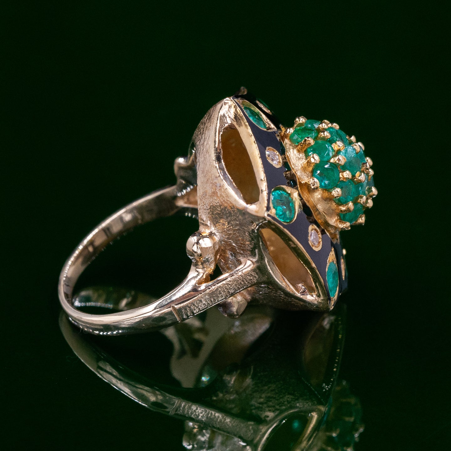 Vibrant green emeralds glow against black enamel in this spectacular 1960s cocktail ring! The glistening Colombian emeralds are clustered in a dome that rises from the center of a hexagonal shaped halo that surrounds. The sides of the ring's hexagonal top are elegantly curved inwards, accentuating each of its angles as larger emerald stones are flush-set in almond shaped gold that beautifully nestles into each pointed corner. Gold-bezeled diamonds are flush-set in between each emerald, centered along each of the top's six sides and shining brilliantly against the deep black enamel that fills the frame and completes the ring with a bold contrast. This ring has all the elements of the best cocktail rings: size that makes a statement, an original design full of unique character, striking gems and color combinations, and shimmering, glittering, shine!