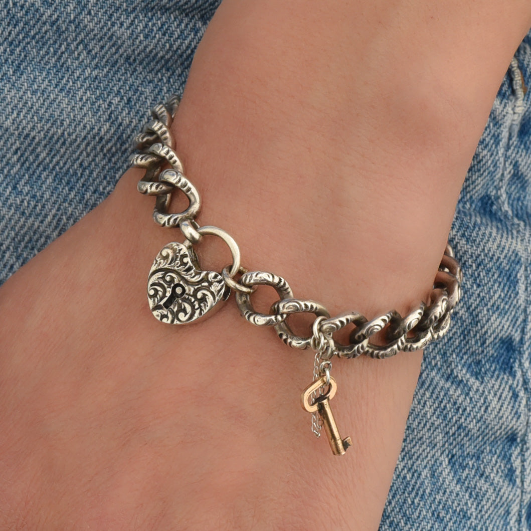 This bracelet has our hearts under lock and key! A classic design of the late Victorian era, this padlock bracelet is made special by the beautiful scrolling carvings that outline the darling heart and every single chubby link! Handmade around 1890, each softly-curved link interlocks with one another and results in this perfectly constructed curb-link chain bracelet. The beautifully detailed heart-shaped padlock is the sweetest part and is fully removable for wear on other chains! It helps anchor the bracelet and highlights its soft, romantic details, while doubling as a working, secure clasp complete with its original key, dangling from a short chain always at the ready. The attention-to-detail achieved on this antique bracelet perfectly encapsulates the outstanding craftsmanship of the Victorian era! It is in great condition and ready to find a new loving caretaker!