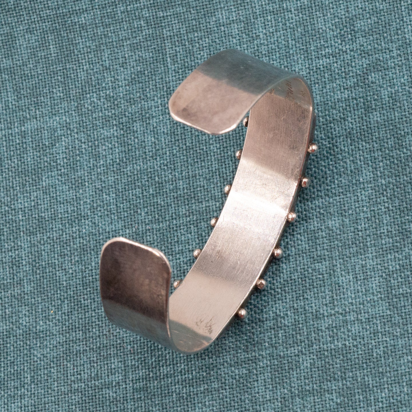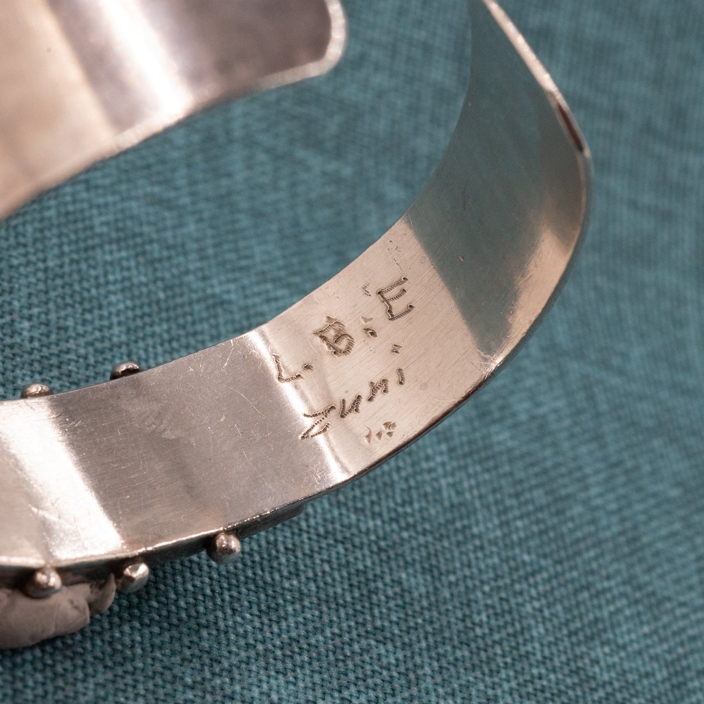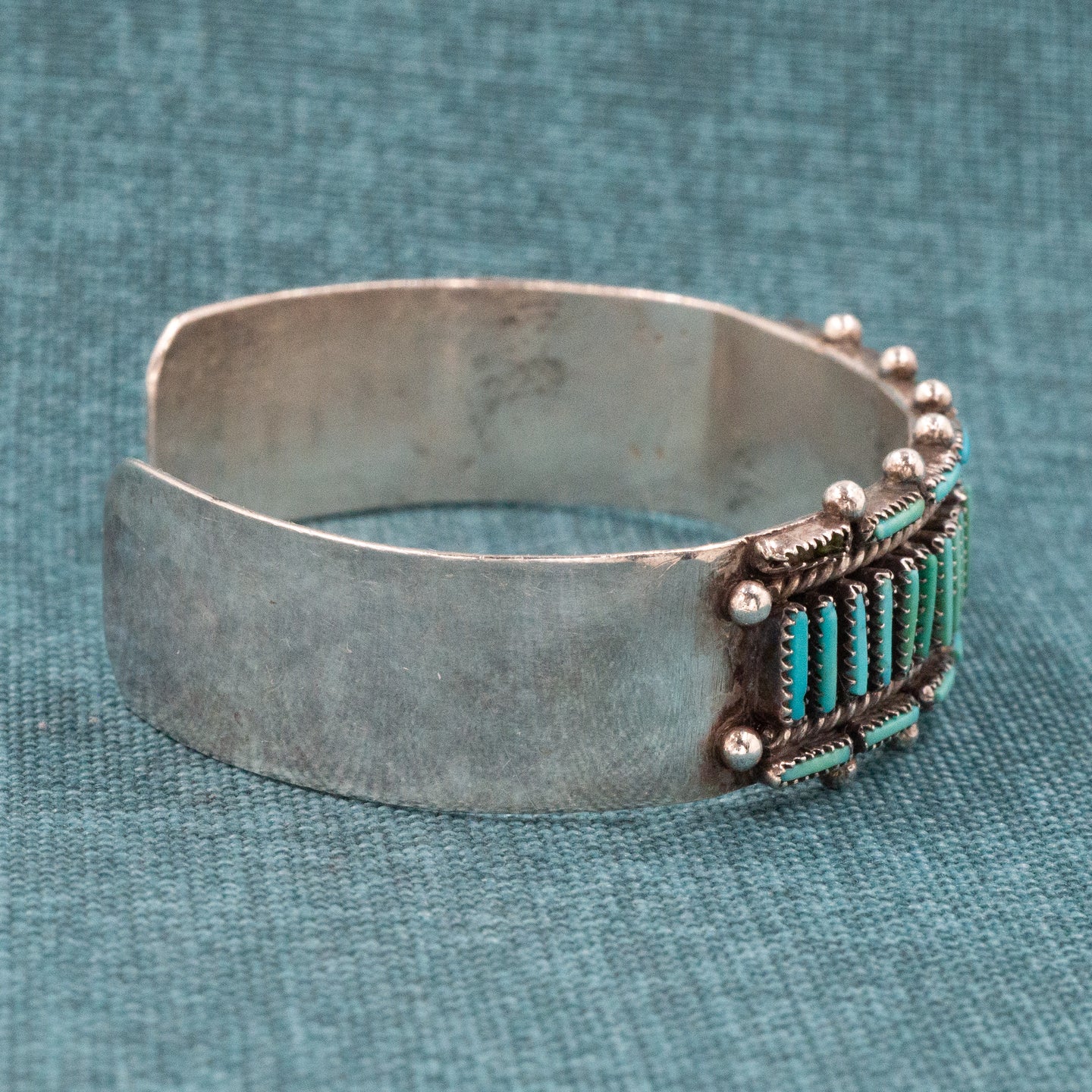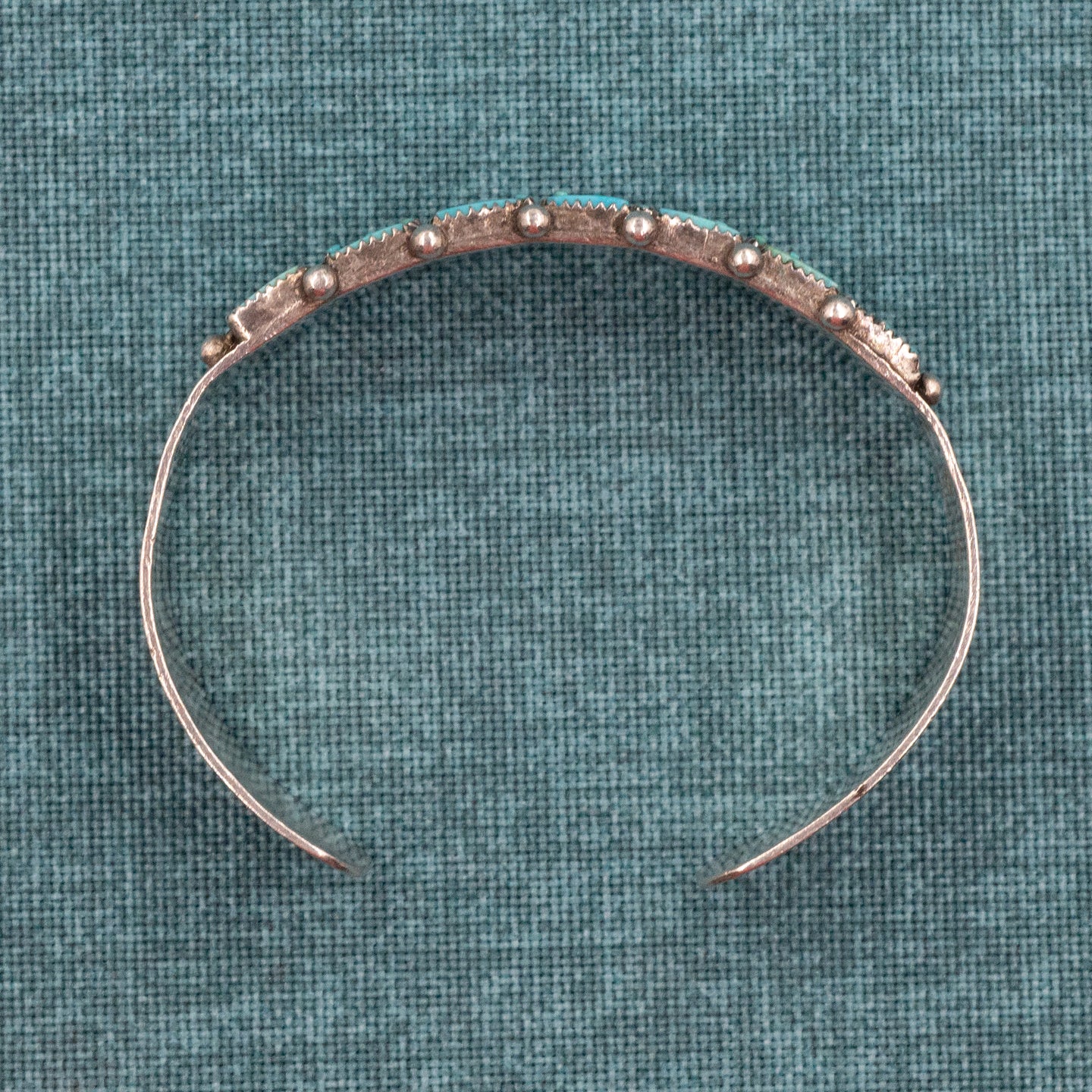 'Petit Point' is a type of Zuni design that features small, uniformly-cut stones set together to create a larger design. This handmade cuff, dating to the 1960s, features a continuous row of angular-cut turquoise stones, accented by twisted rope and beads at the top and bottom. The colorful stones are set atop a slim and sleek silver cuff, which can be adjusted slightly. This vintage cuff can be styled on its own or as a colorful accent to a layered wrist stack - it is a great addition to any Native American or Southwestern jewelry collection!
