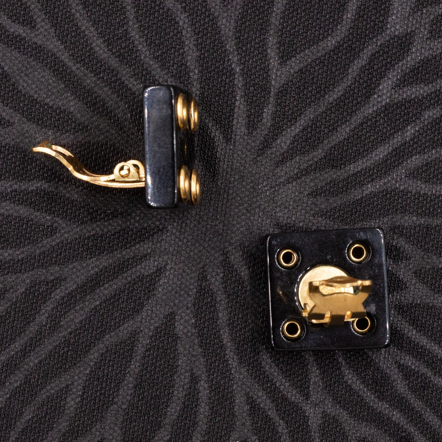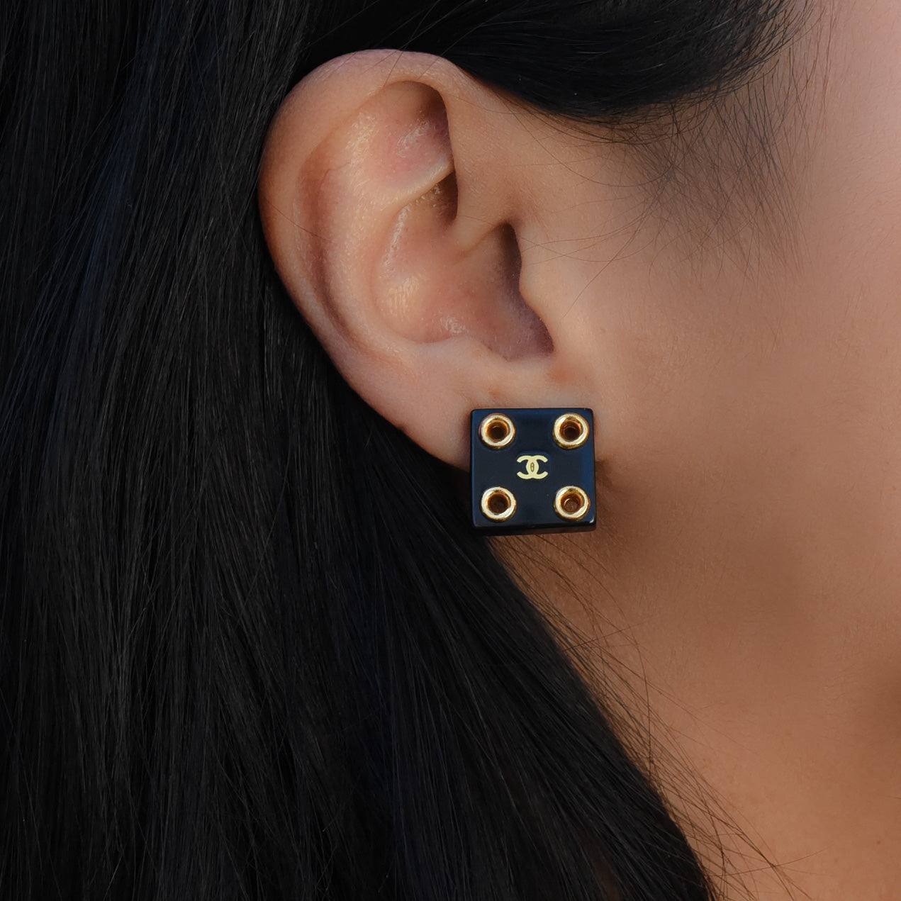Coco Chanel popularized costume jewelry in the 1920s and remains one of the most renowned makers of costume jewels to this day! This pair of clip-on earrings features jet black lucite squares accented with gold eyelets in each corner. Chanel's iconic double-C logo shines in complementary gold lettering at each center, adding an instant touch of couture allure to the button-style earrings. This distinctive Chanel design dates to 2001. Their distinguished hallmarks, stamped at the base of each backing, attest to their undeniable authenticity.
