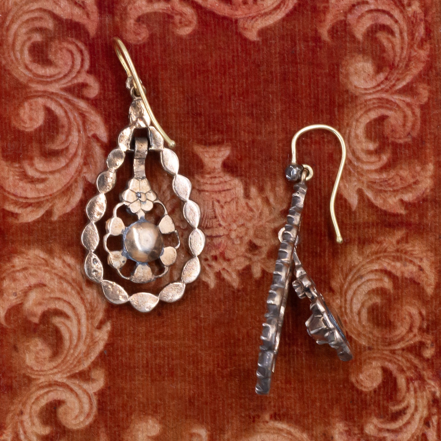 We cannot resist the enchanting aesthetic of Georgian jewelry... and neither could the Victorians! Entirely handmade around 1880, this pair of drop earrings features a sparkling array of rose-cut diamonds. Each is set in a closed-back clawed collet setting inspired by Georgian-era jewels. A single row of these glittering stones create a droplet-shaped dangle that hangs freely from a simple hook in each earring. A gold flower hangs within each droplet, atop a dial of diamonds that fills the center, adding articulated motion to the earrings. The lively dangles dance with their wearer, enhancing the diamonds' sparkle and bringing these antique earrings to life. The old-cut diamonds are magical in low light and most brilliant in the romantic, flickering candlelight they were made to shine in. Adorning the ear with dreamy, antique allure, these Georgian Revival earrings remain gorgeous in any and every light!