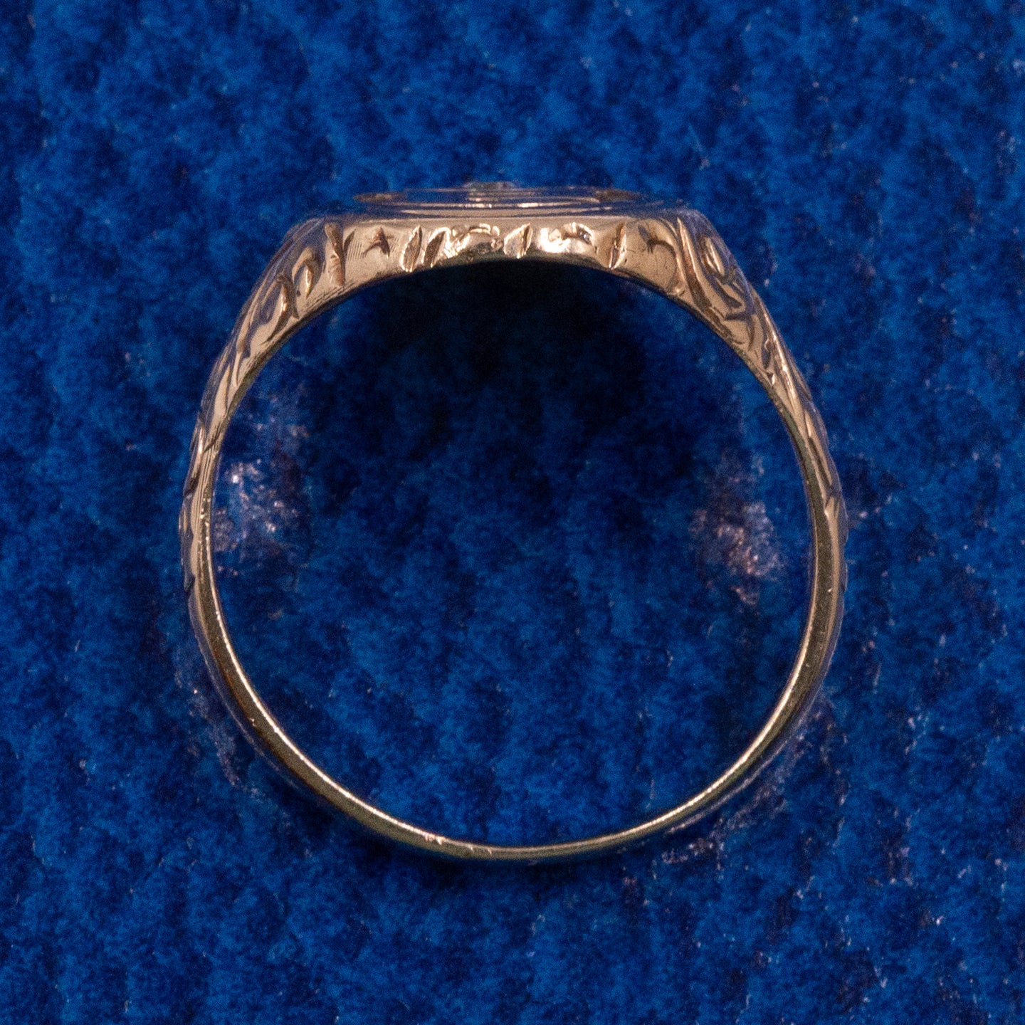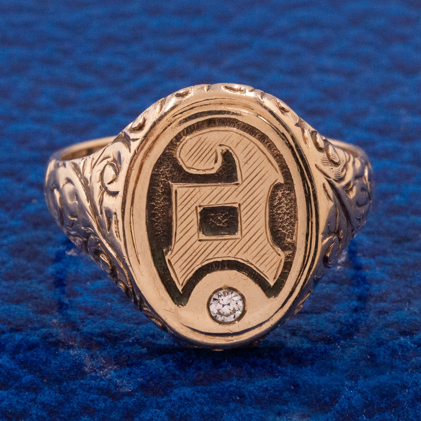 A mysterious signet! Handmade in the 1930s, this handsome signet ring features an ambiguous initial that spans the top of the ring alongside a gleaming inlaid diamond. The engraved initial is up for your interpretation: it could be a lowercase ‘a’, ‘e’, or even ‘p’! Could it be another character in an altogether different language? In any case, its intriguing font and style is delightfully handcarved with gorgeous scrolls that flourish like luscious plumes, framing the signet and adorning the shoulders. The deeply carved details create dynamic highlights through years of finely aging with no polish– their dark patina perfectly contrasts the gleaming rose gold!