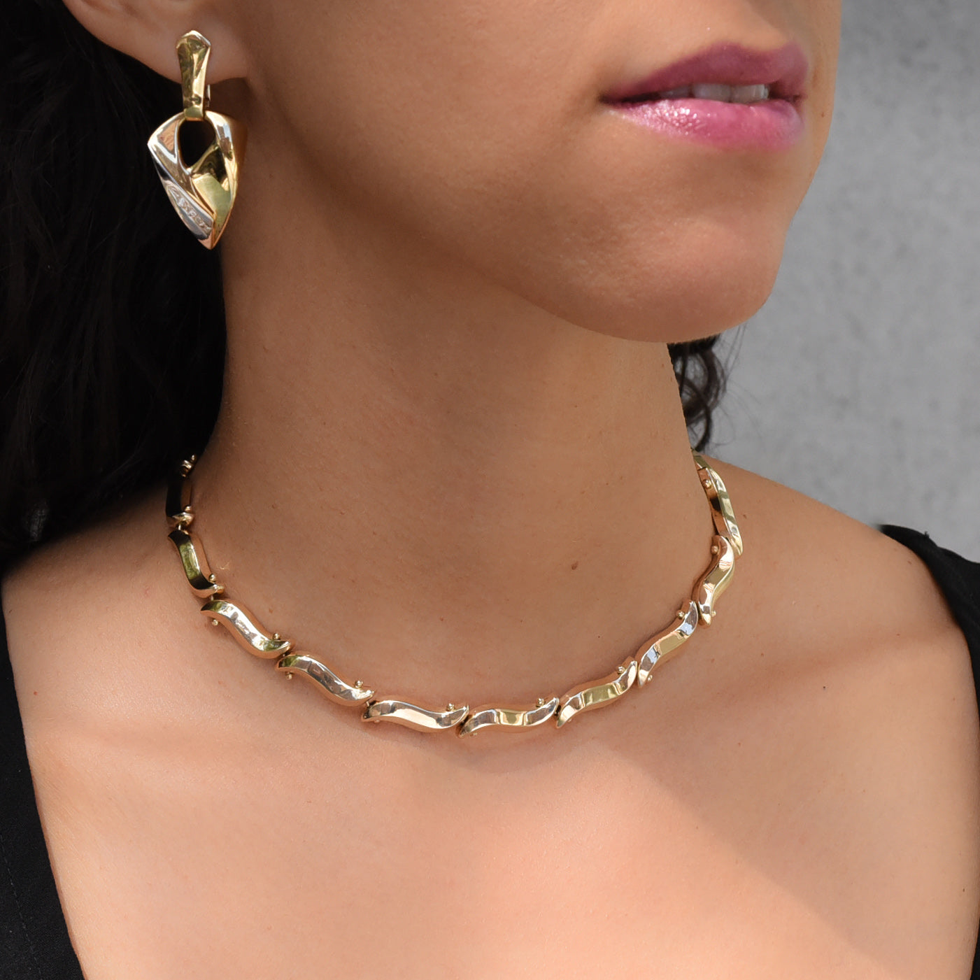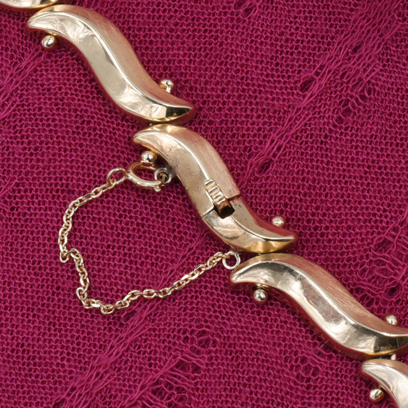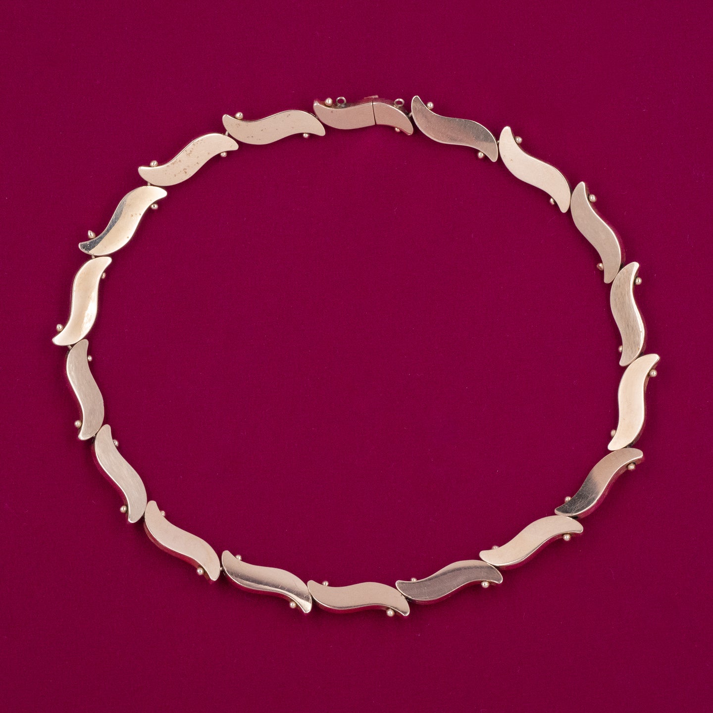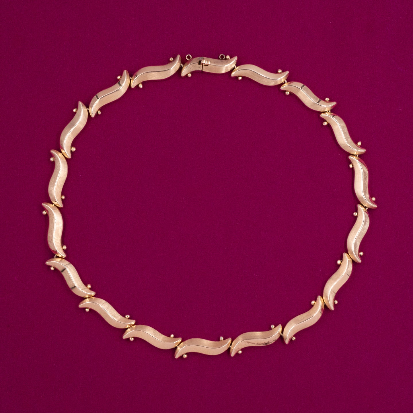 This gorgeous gold necklace accentuates the sensual curves and ridges around the décolletage as it drapes elegantly around the collar! Each link is a three dimensional tilde, or wavy dash, with a ridge rising through its center like the tops of desert dunes. A curved pin with gold beads on each end connect one link to the next as the beads perfectly nestle into the curved ends. The result is a simple yet refined pattern that catches the light and gracefully glistens as it adorns the neck like a shining wreath. Handmade in the 1960s, this endless gold collar feature a cleverly hidden clasp within one of its links!