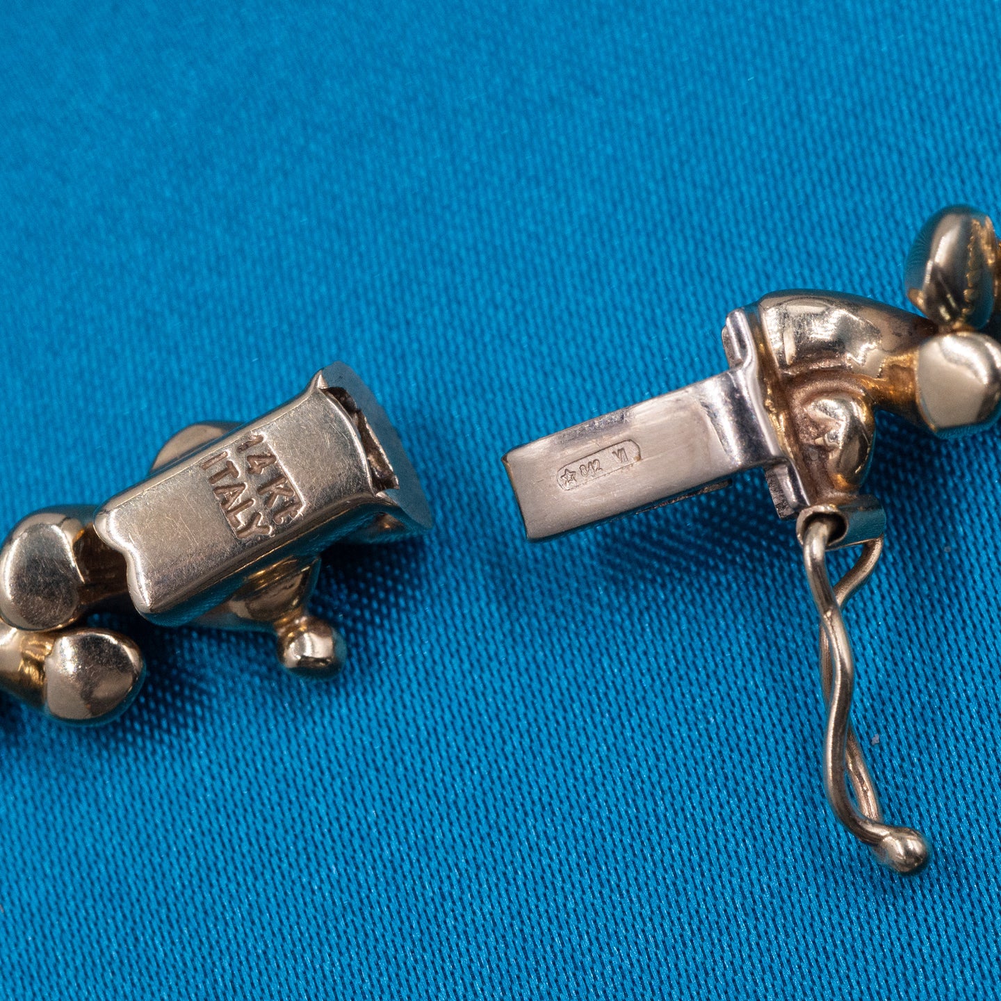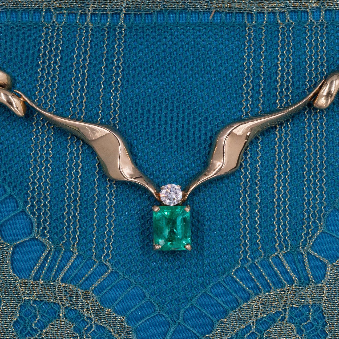 A stunning Colombian emerald glistens alongside a glittering brilliant diamond as they anchor this spectacular gold collar! The verdant emerald glows like a moonlit garden, cut in its classic open-window shape, the emerald cut. It is prong-set below a sparkling round diamond as elegantly sculpted gold extends like wispy wings in flight or magnificent horns on either side of the stones, connecting the gems to the luscious San Marco link chain that beautifully embraces the organic curves of the neck. Crafted in the 1980s by fine jewelers in Italy, this gorgeous necklace makes a sophisticated statement with its bold yet refined design. Its centerpiece drapes beautifully between the collarbones as the sculpted gold mimics their shape, complementing the natural beauty of the human form and adorning it with Earth's finest treasures!