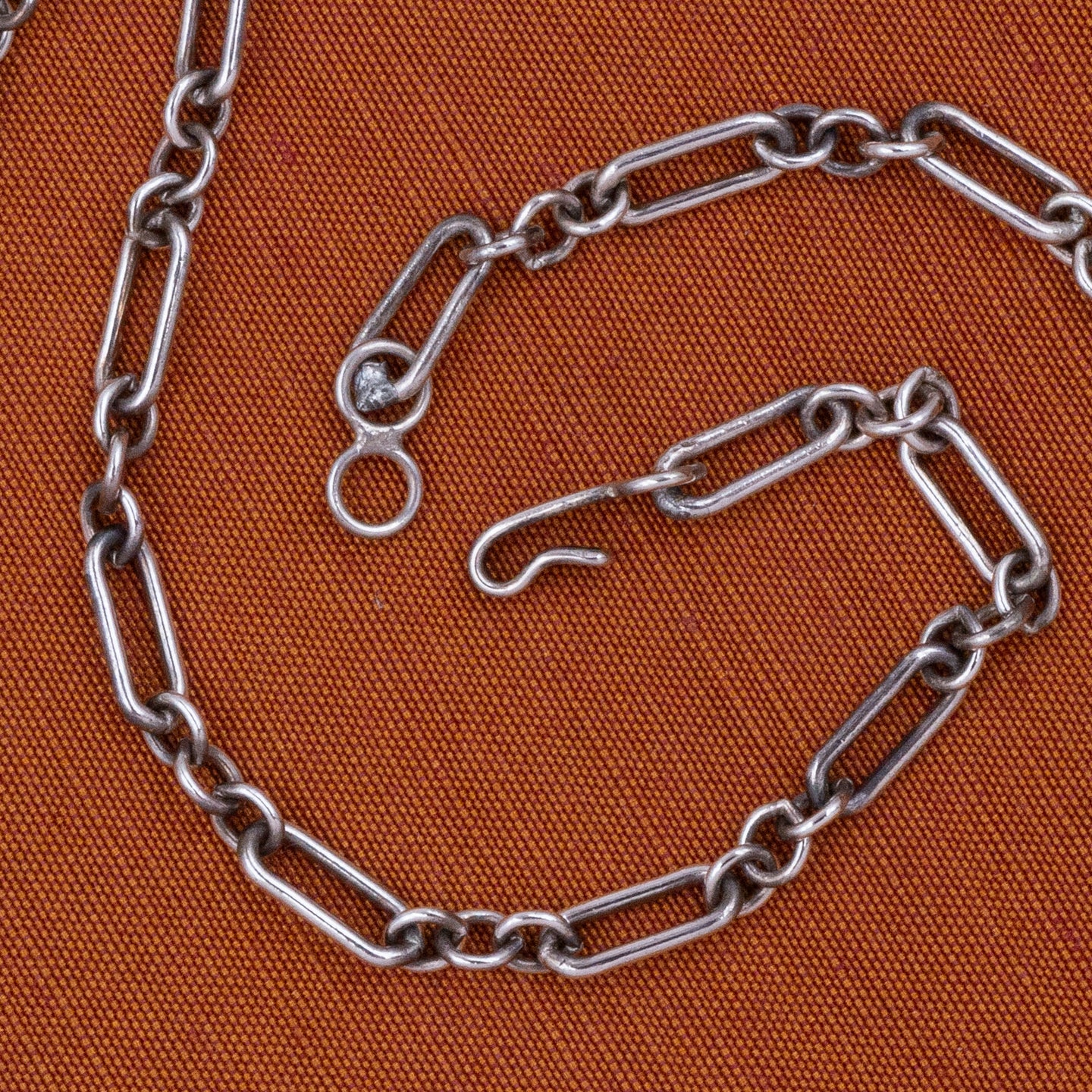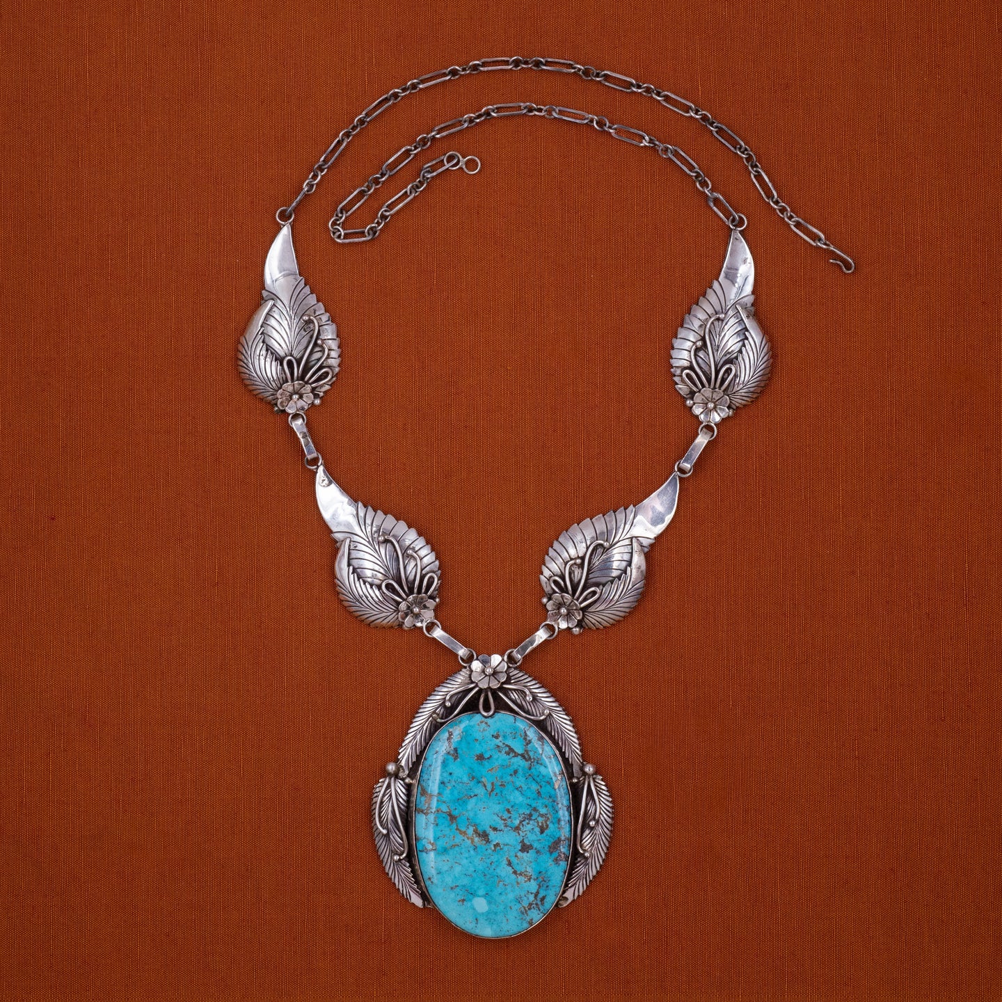 Completely handmade by expert Native American jewelers, this vintage necklace centers a polished oval-cut turquoise stone with heavy black matrixing that brightly adorns this work of art. Handcrafted in 925 sterling silver, the result is a stunning color contrast. The silver links are modeled from nature with great dimension and they boast a beautifully aged patina that highlights its fine details! The necklace is complete with a flexible chain that secures with a hook clasp, which allows it to be slightly adjustable.