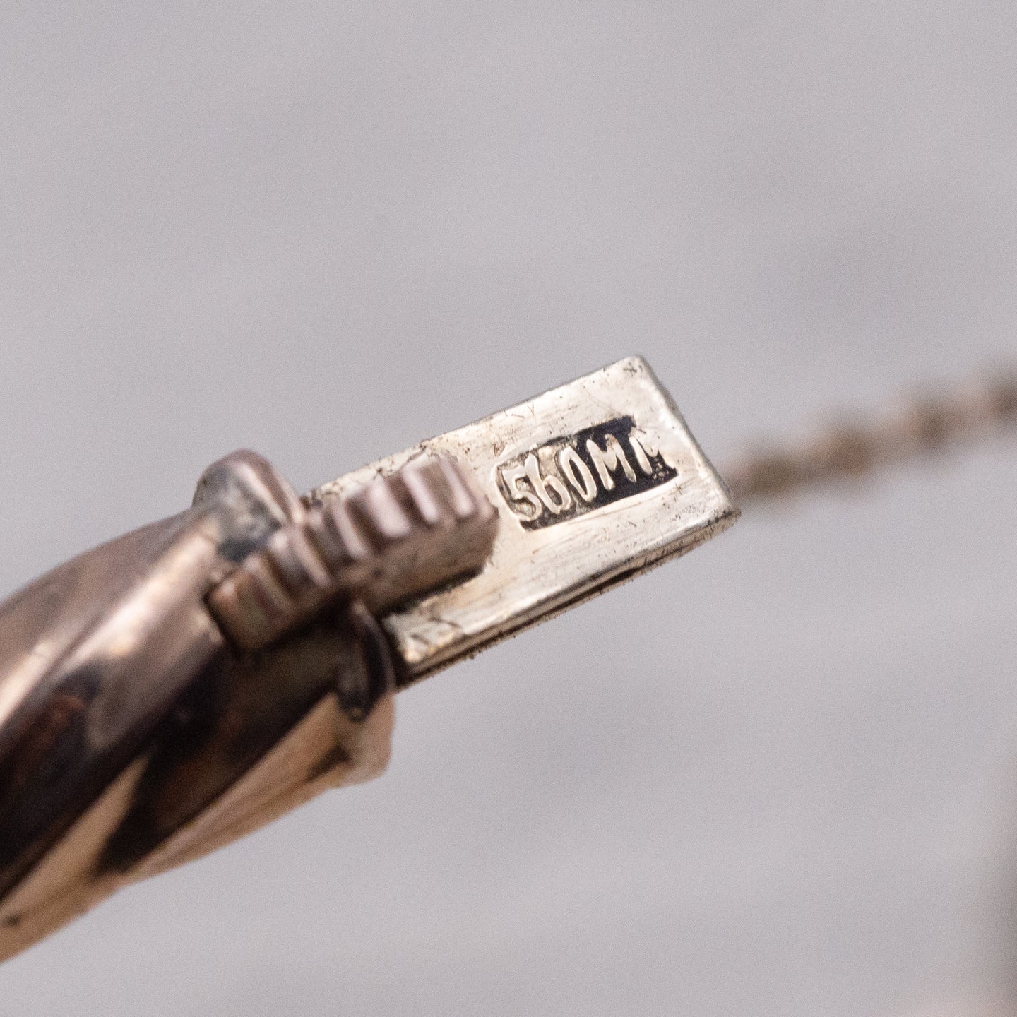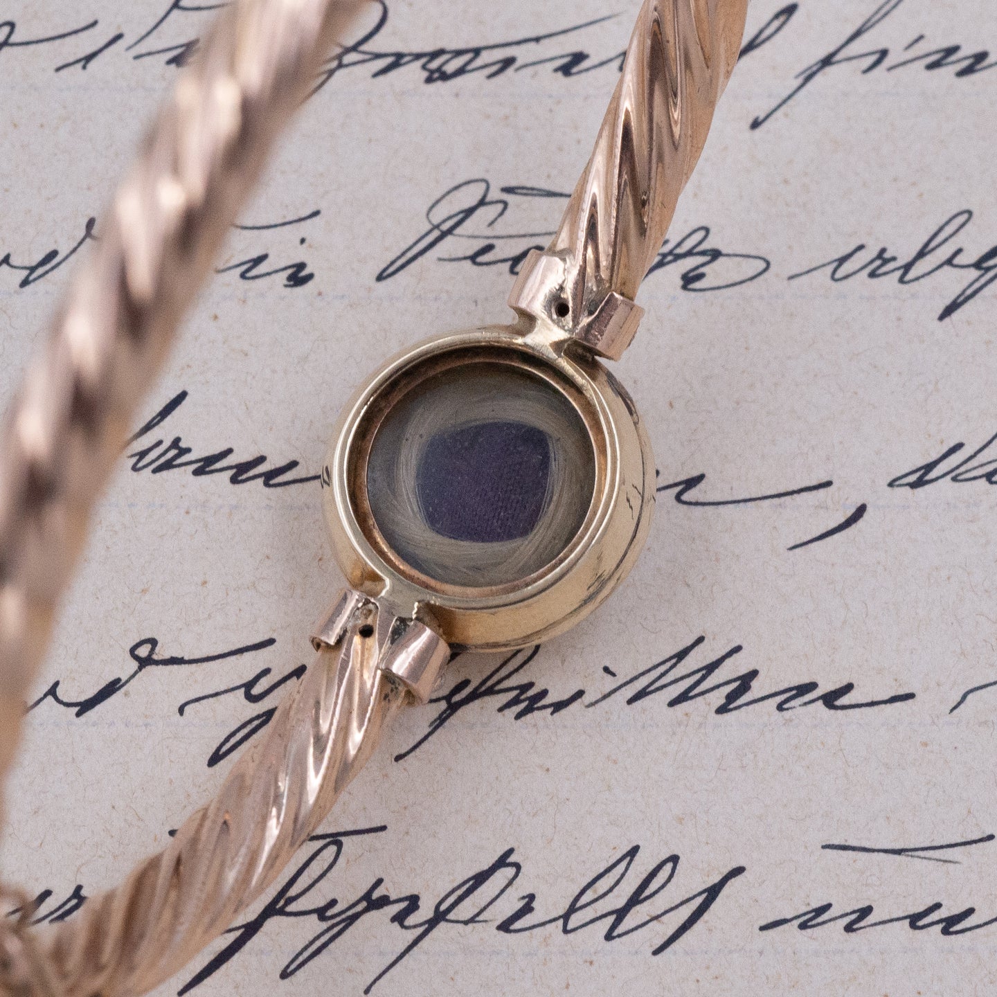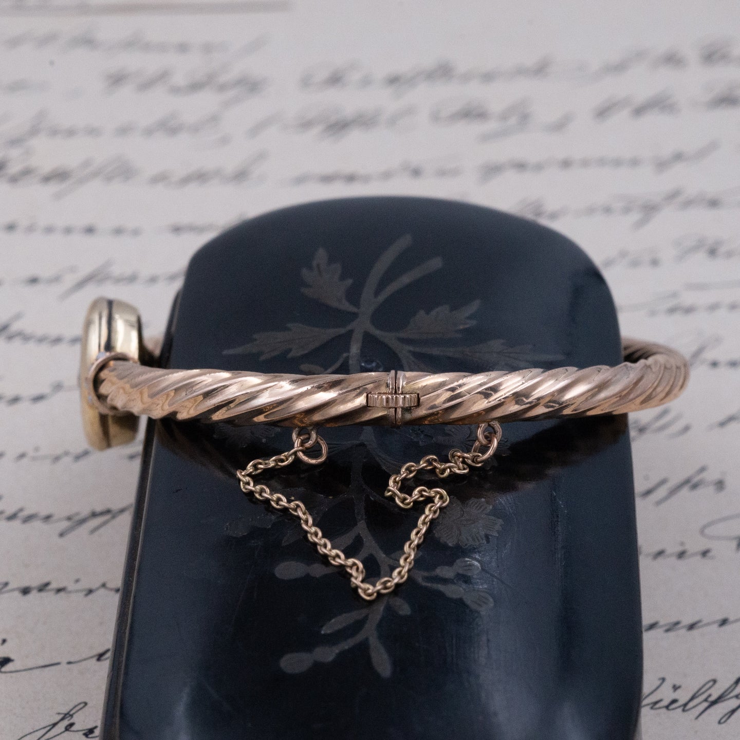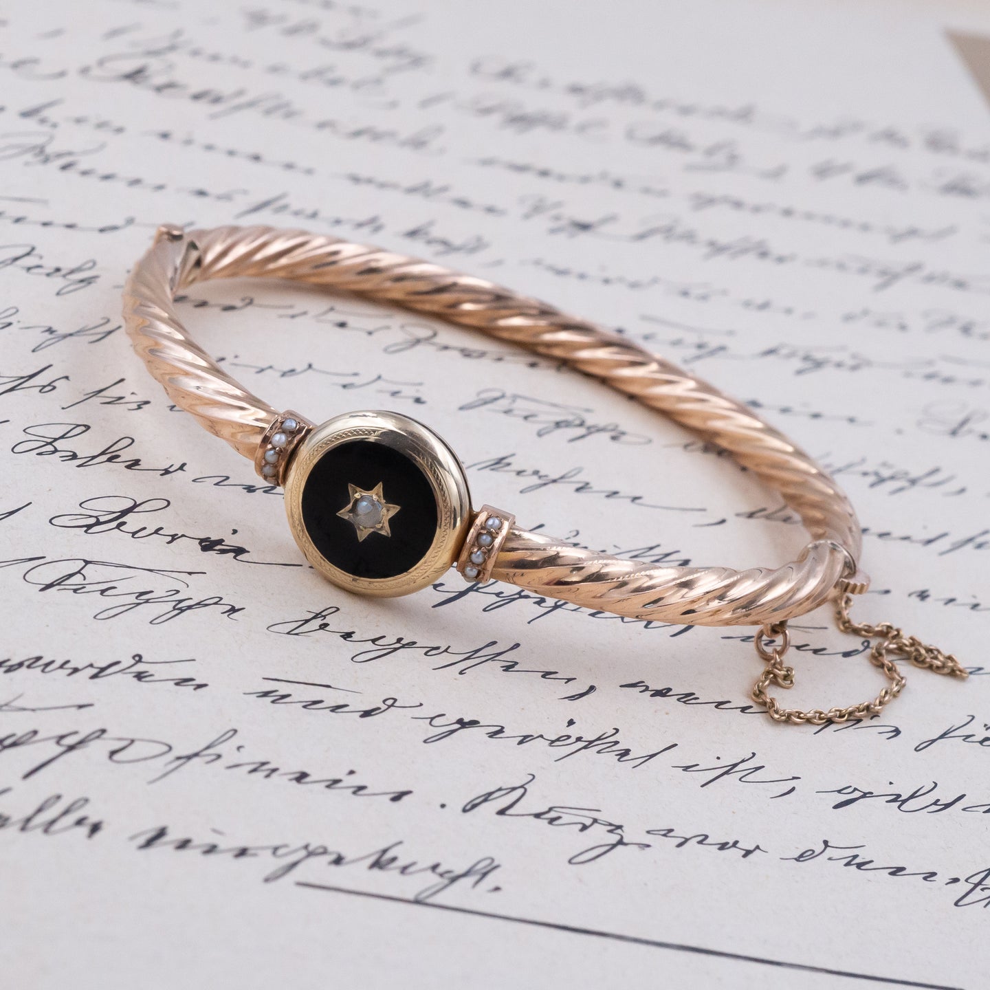 When Queen Victoria lost her husband, Prince Albert, in 1861, she went into deep mourning and wore black for the rest of her life. As the beloved queen does, so do her people, and black became the most popular color to accent or feature in jewelry throughout the Victorian era, often using materials like jet and onyx. This antique memorial bangle is a wonderful example, featuring a lustrous natural pearl sitting elegantly at the center of an onyx disk, which conceals a glass panel in the back. A beautifully braided lock of hair rests within the compartment, protecting the precious life memento for decades to come. Unlike most jewelry of the era, this bangle is not overly ornate – it allows the simple braided design of the bangle to guide the eye to the alluring centerpiece. This hinged bangle opens and shuts with a tongue-in-groove click-in clasp, and it is complete with a safety chain for added security. This antique memorial bangle is in fantastic condition – an excellent example of true Victorian craftsmanship!
