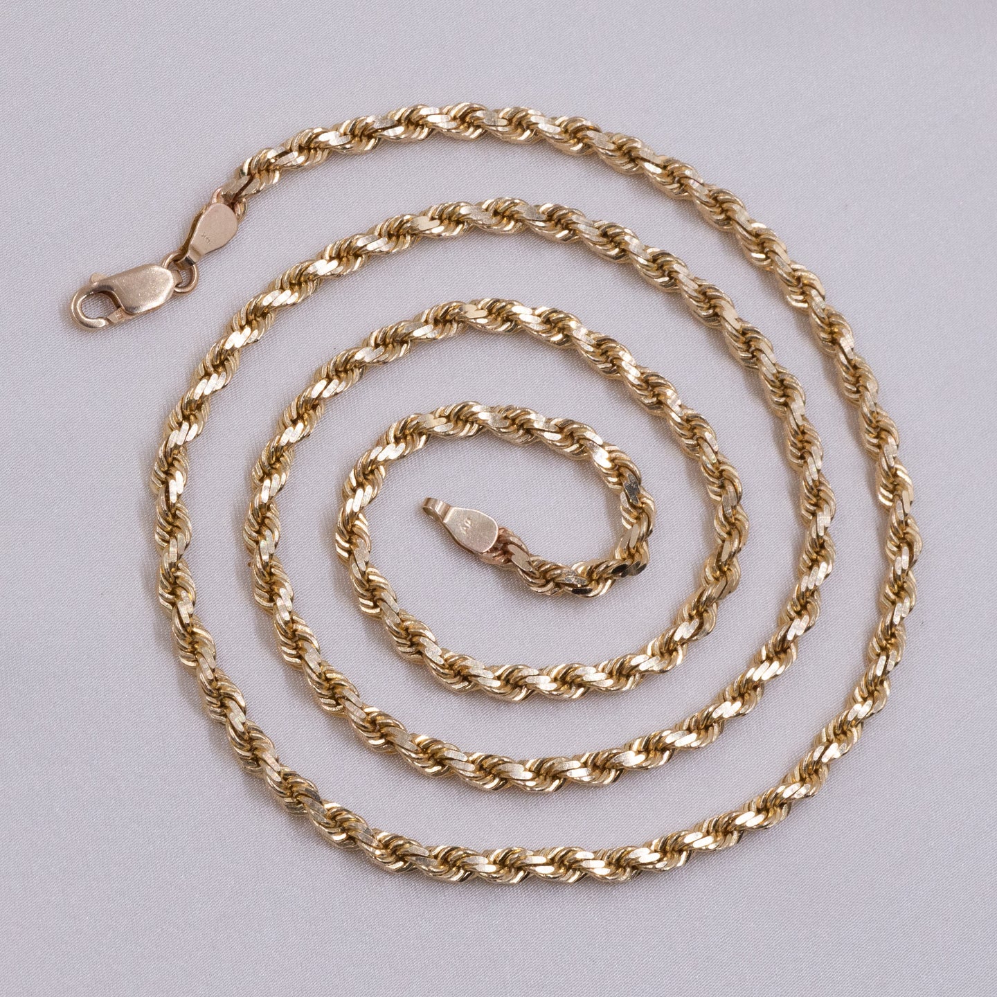 This classic solid gold rope chain is an impressive example, boasting beyond dazzling thick and weighty links. Set in warm 14k yellow gold, this chain is made up of thousands of small links that weave together to create a sturdy rope. Each tiny link in the rope design is cleanly cut on its top surface with a highly polished mirror-like finish. Each reflective surface flows into the next creating a fiery glitter throughout the chain as it meets the light. At 24 inches long, this chain is perfect for styling on its own and also pairs well with sizable pendants and charms.