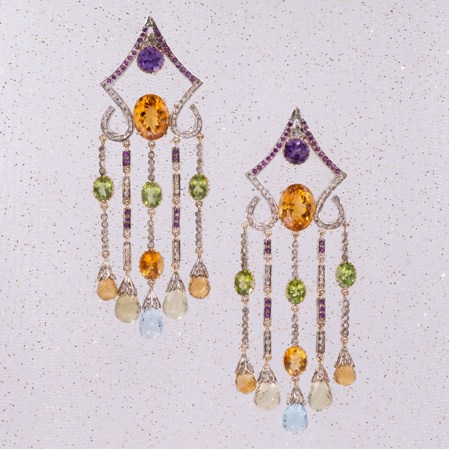Vibrant, dazzling gemstones and brilliant, glittering diamonds sparkle wildly throughout these magnificent vintage chandelier earrings! Five long diamond and ruby strewn strands dangle with radiant briolette topaz and citrine drops. Set in sterling silver with 18k yellow gold backings and findings, these fabulous statement earrings combine a solid top with flexible strands that dance with the wearer. The tops elegantly come to a point at the top where a rich, regal purple amethyst glistens above the largest gem– a flickering, fiery orange citrine. Set halfway down alternating strands are vivid, lime green oval-cut peridot stones, while an additional citrine drops from the center strand and is completed with a bright blue topaz briolette. Full of color, light, and life, these earrings are bound to add festive joy to any collection!
