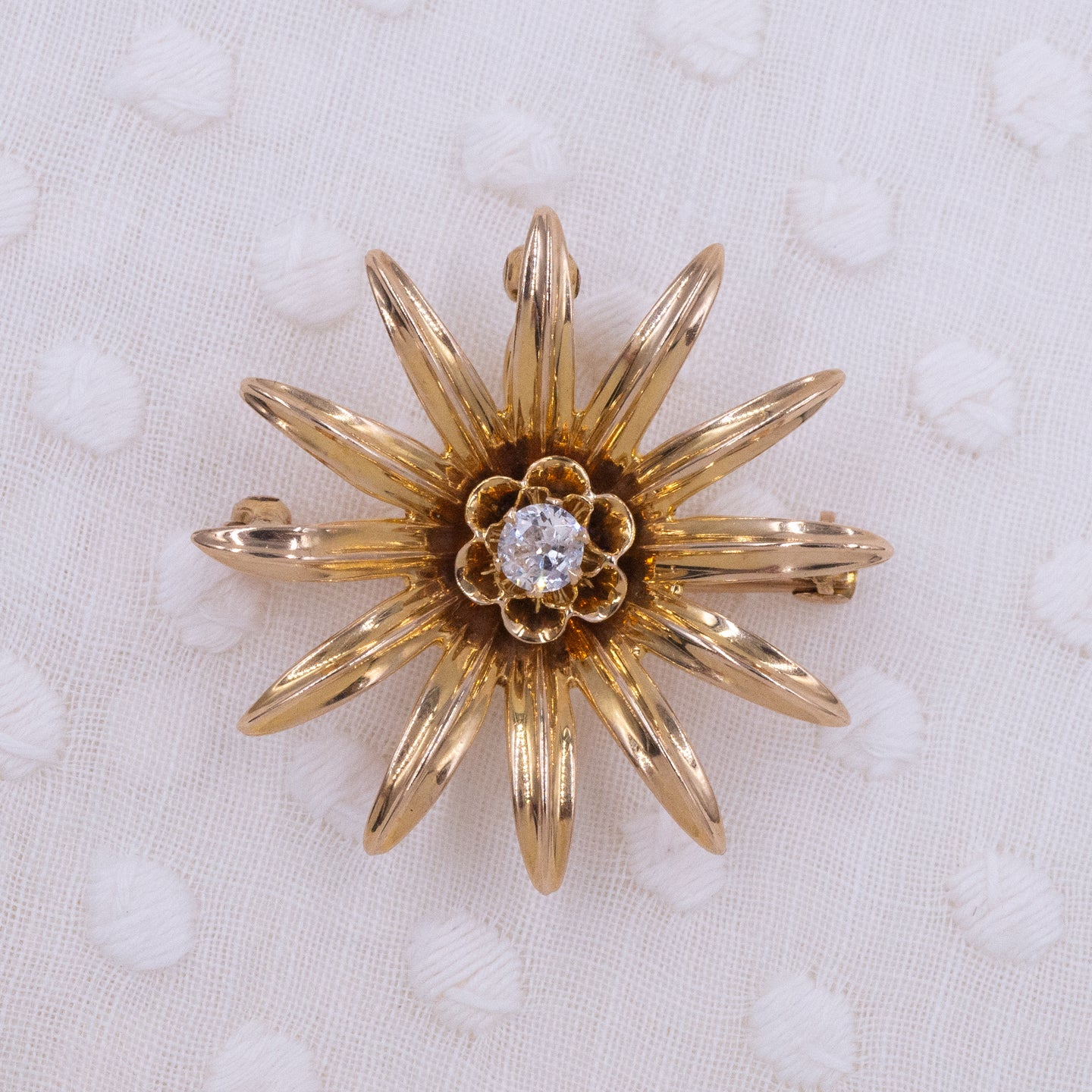 A radiant gold daisy centers a glittering old European cut diamond in this adorable bauble from the Edwardian era! Made around 1910, this piece doubles as both a pin and a pendant with a hideaway bale that easily tucks behind the daisy when worn as a pin and flips out for stringing on a chain and wearing as a pendant! The fiery diamond at its center twinkles in the light, adding an elegant touch to this sweet charm. Whether enjoyed as a pin or pendant, this playful daisy is certain to add joy and sophistication to any ensemble!