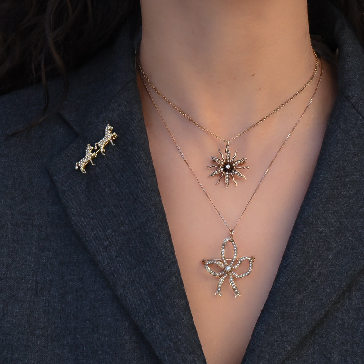 - Pictured with our Seed Pearl Starburst Pin/Pendant and Seed Pearl Bow Pin/Pendant