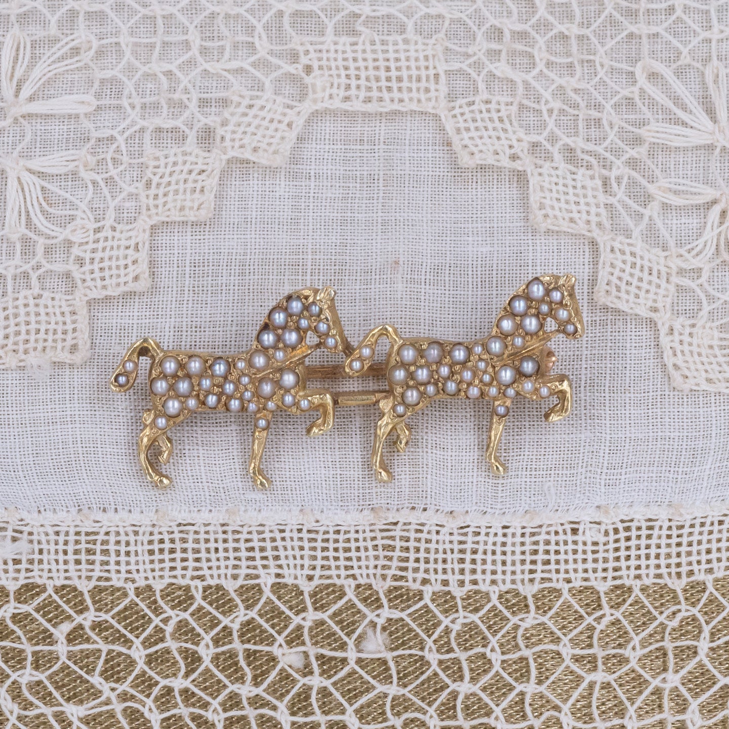 The prettiest pair of ponies prances across this petite pin, polished with pavé-set pearls! Say that two times fast, one for each of the sweet horses on this charming little Edwardian brooch! Made around 1910, this equestrian bar bin is set in rich yellow gold with lustrous, natural seed pearls! Perfect to wear on a lapel or along a pocket, and truly lovely on anything it graces! or with C.1910 14k natural seed pearls