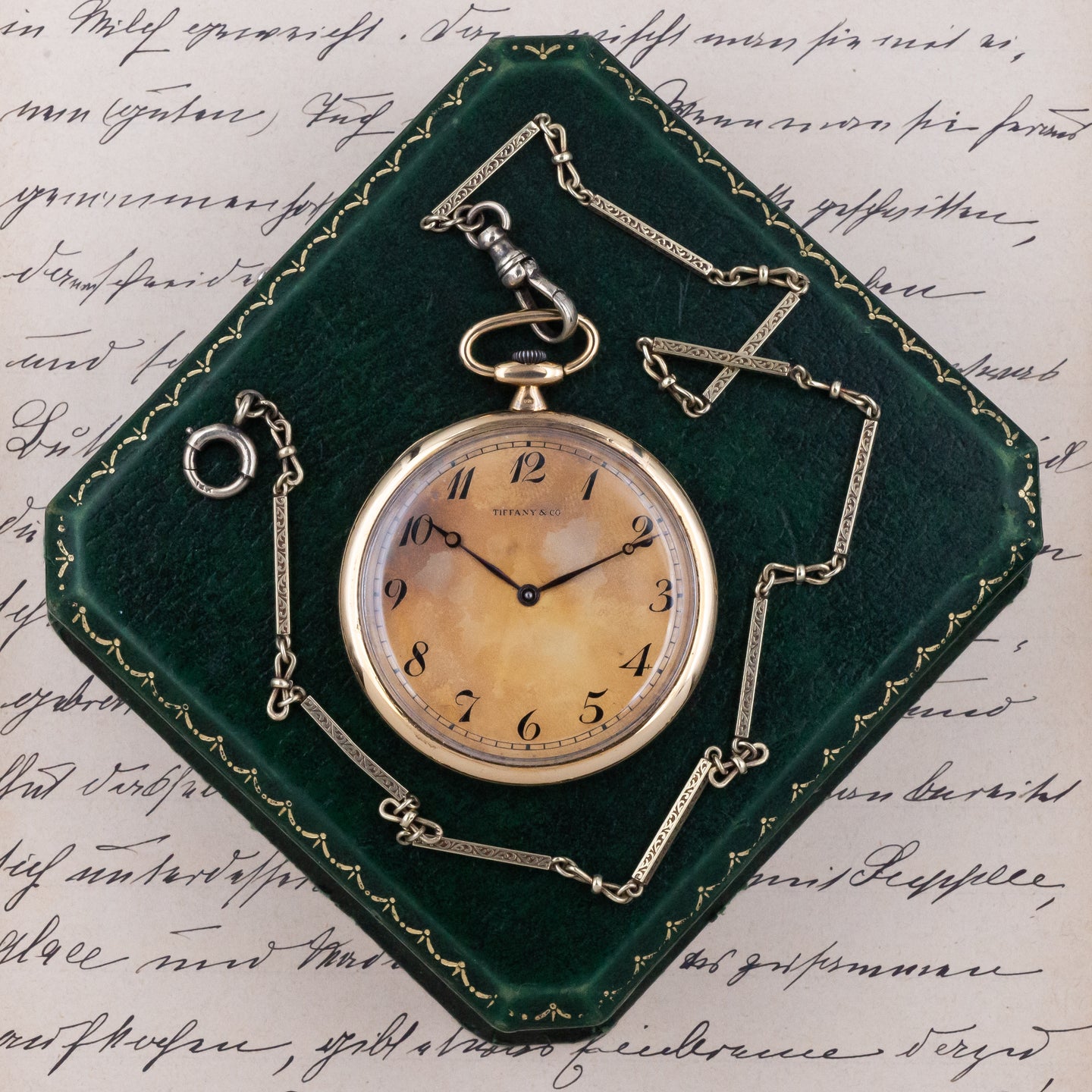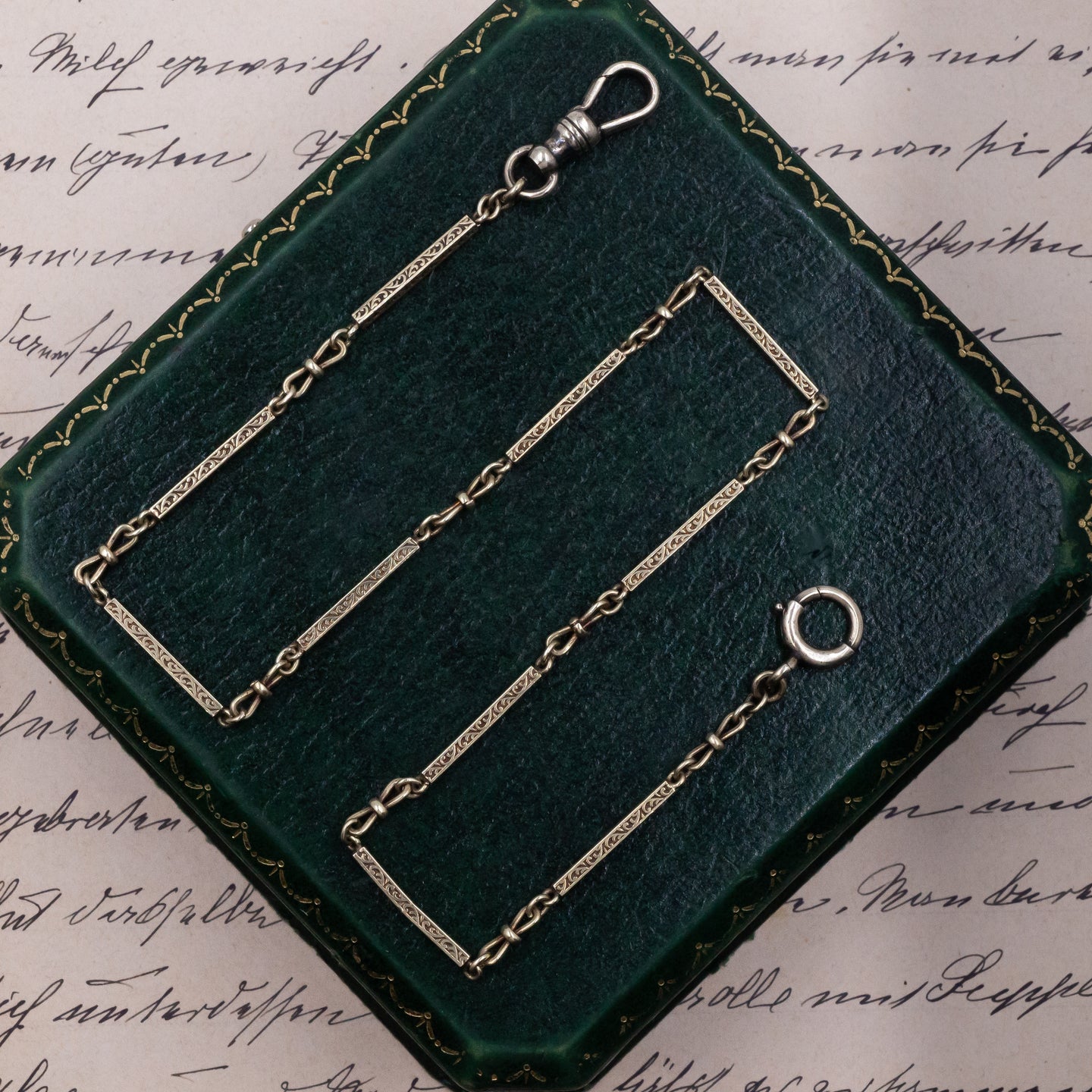 Deeply carved, intricate flourishes scroll along the four sides of each long baton link in this gorgeous Edwardian pocket watch chain. At first glance this tiny carved pattern appears as a fine texture in the warm gold, but as the gaze lingers over each link, the incredible artistry of each tiny feathery flourish becomes clear against the carving's perfect patina. Made around 1910, this chain was made for wear with a pocket watch, complete with a dog-clip on one end and a sizable spring ring on the other. Today it can be worn as a short collar necklace or fastened with another chain or extension to add length! A chain with this level of finely carved detail is a rare find in our modern times– what a joy that we can still turn to antique watch chains for their unmatched beauty and artful craftsmanship!