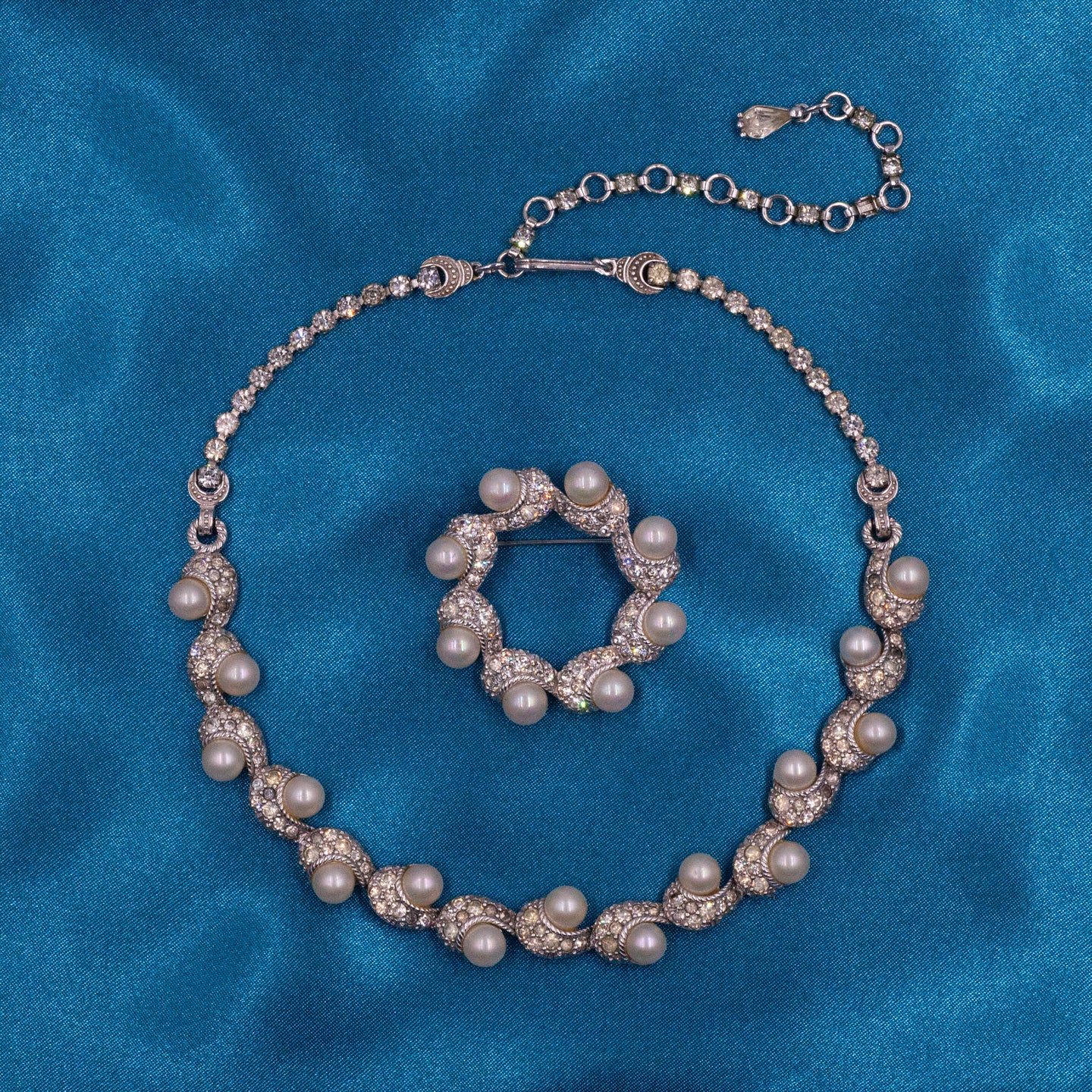 Pennino jewelers was founded by brothers Oreste, Frank and Jack Pennino in 1926 right here in New York City. Their cocktail jewelry was always exquisitely-crafted, using plated metals, high-grade rhinestones and with classic design but at the top of the current fashions. This stunning 4-piece set is comprised of an adjustable necklace, earrings, brooch and bracelet, all made around 1950s. Combining flawless craftsmanship and materials with artistic elegance, the set features faux pearls and sparkling clear rhinestones framed within a fluid, playful design. The stones will glitter with every one of your movements, while the pearls soften the bold look with their creamy lustre!