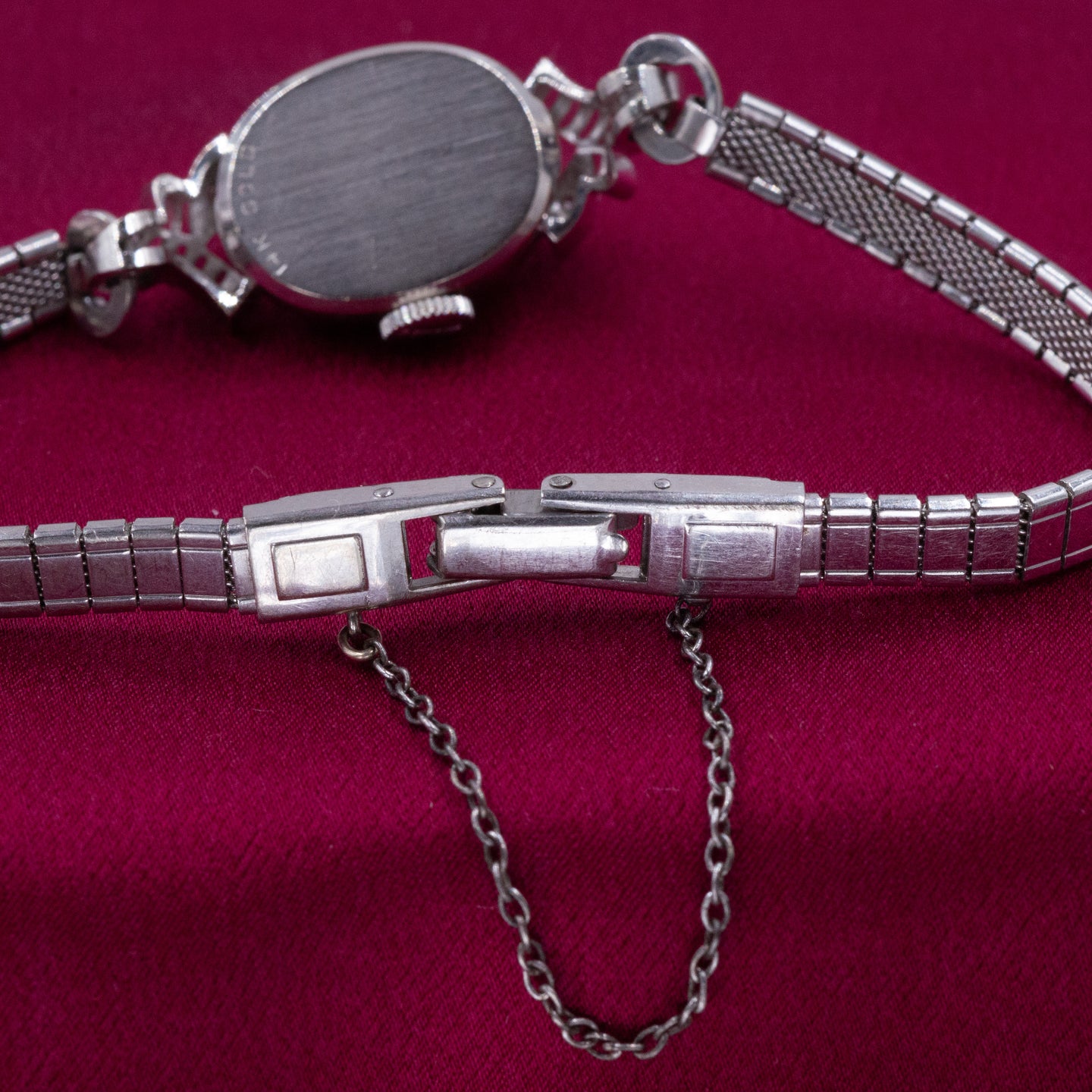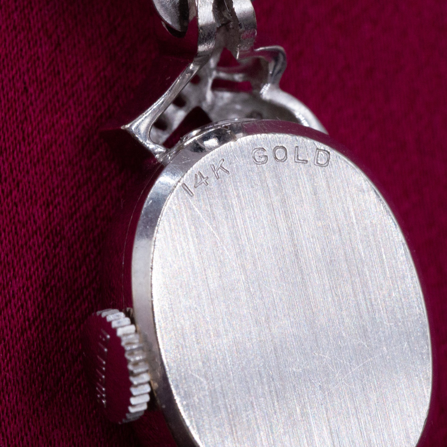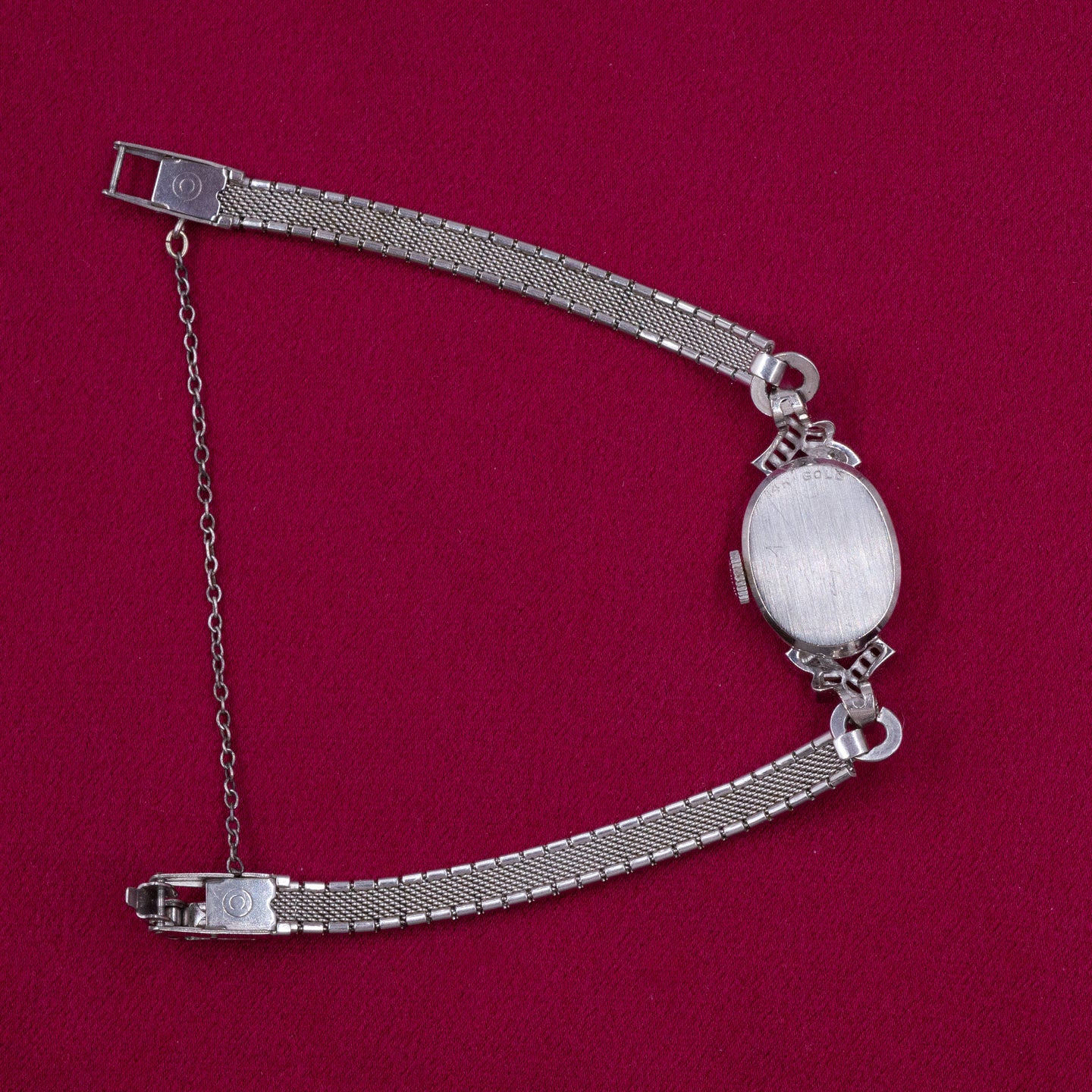 This mid-century wristwatch is just the right day-to-night timepiece! It boasts both a classic design perfect for everyday and a touch of glitter suitable for elegant evenings out. Made around 1960 and set in bright white gold, this fine lady's watch features a finely crafted mechanical movement by Benrus: a well-respected American watchmaker using parts from Switzerland, where the finest watches are made to this day. Its classic oval-shaped face is framed by a gorgeous diamond halo bezel and met with diamond studded leaf shapes and ribbon like adornments that connect to its simple metal link bracelet strap. The simplicity of its strap balances the elegantly adorned case, making it the perfect everyday watch– subtle enough for daytime wear and refined enough for more glamorous occasions!