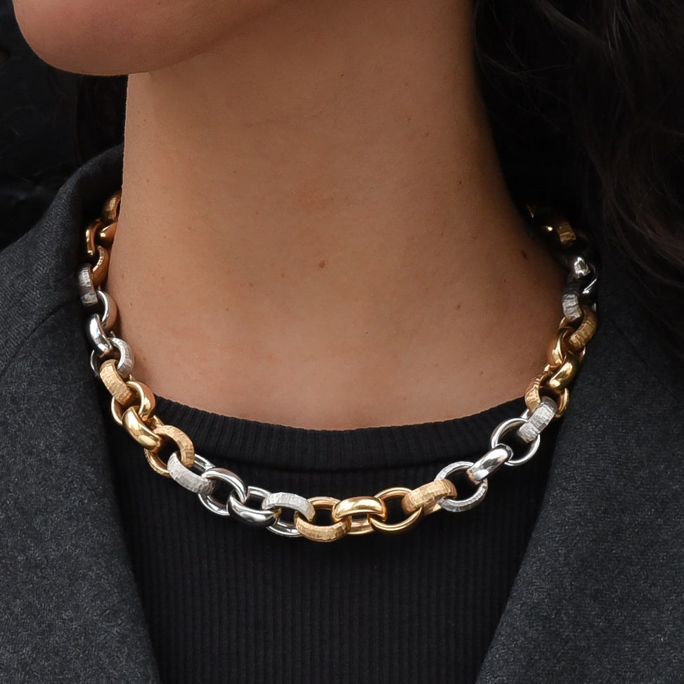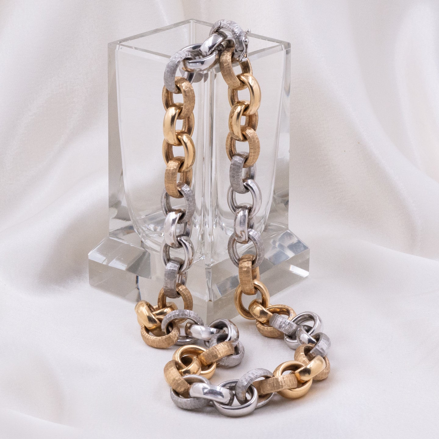 Boldly sized links in a mix of gold tones and textures elevate this quintessential cable chain design and makes a statement! Made around 1990 by talented artisan jewelers in Italy, this 14k gold chain is finely crafted for lifetimes of wear. Its classic look is easy to style with nearly anything while its unique pattern lend personal character. The thick round links alternate between a clean, highly polished finish and an unusual florentine textured, hand-hammered finish. Every four links the metal tone switches from bright white gold to warm blushy yellow gold. This intriguing chain appears endless, with its clasp cleverly hidden within a white gold textured link, allowing for an unbroken pattern. Gorgeous and forever stylish, this chunky gold chain necklace is an easy choice for everyday chic!