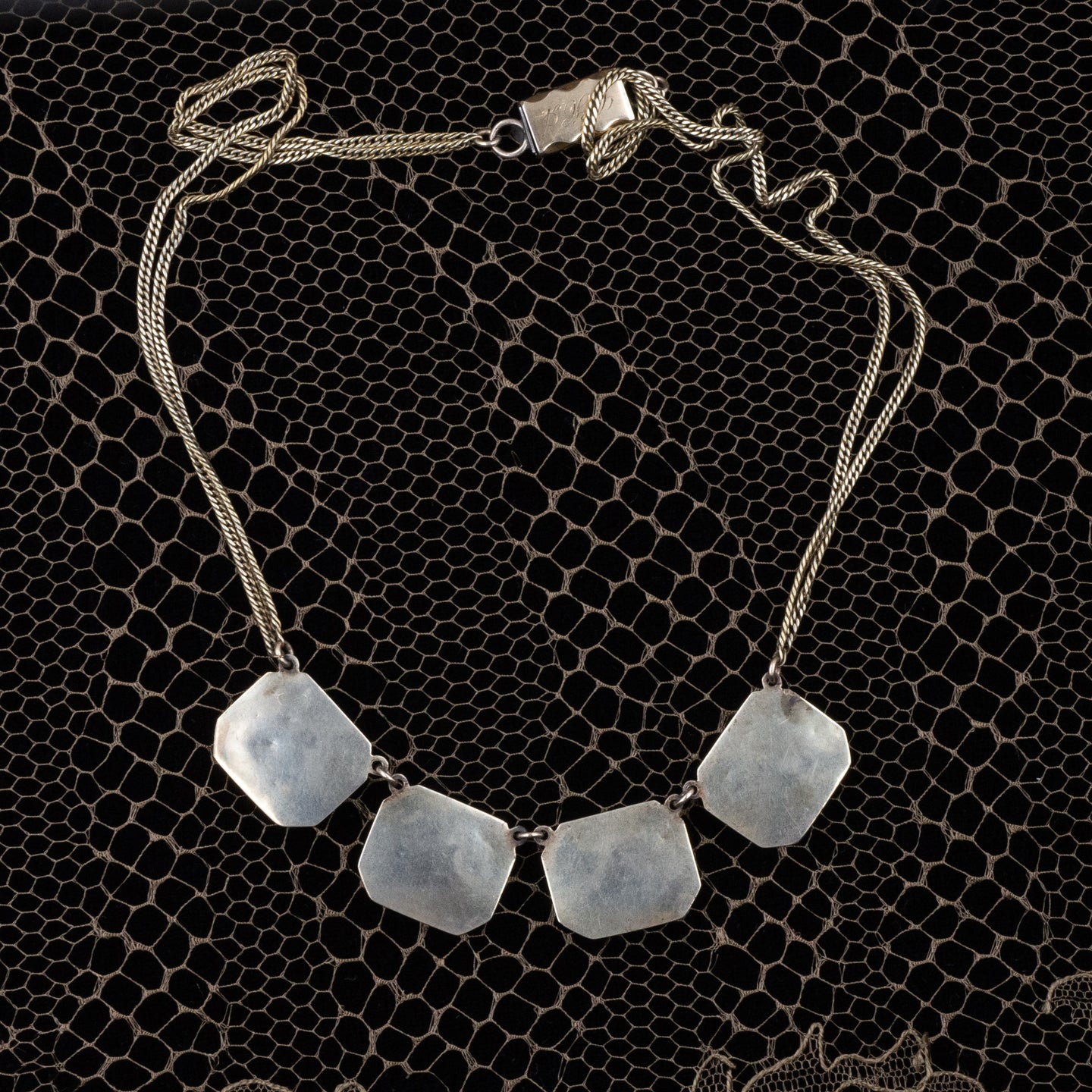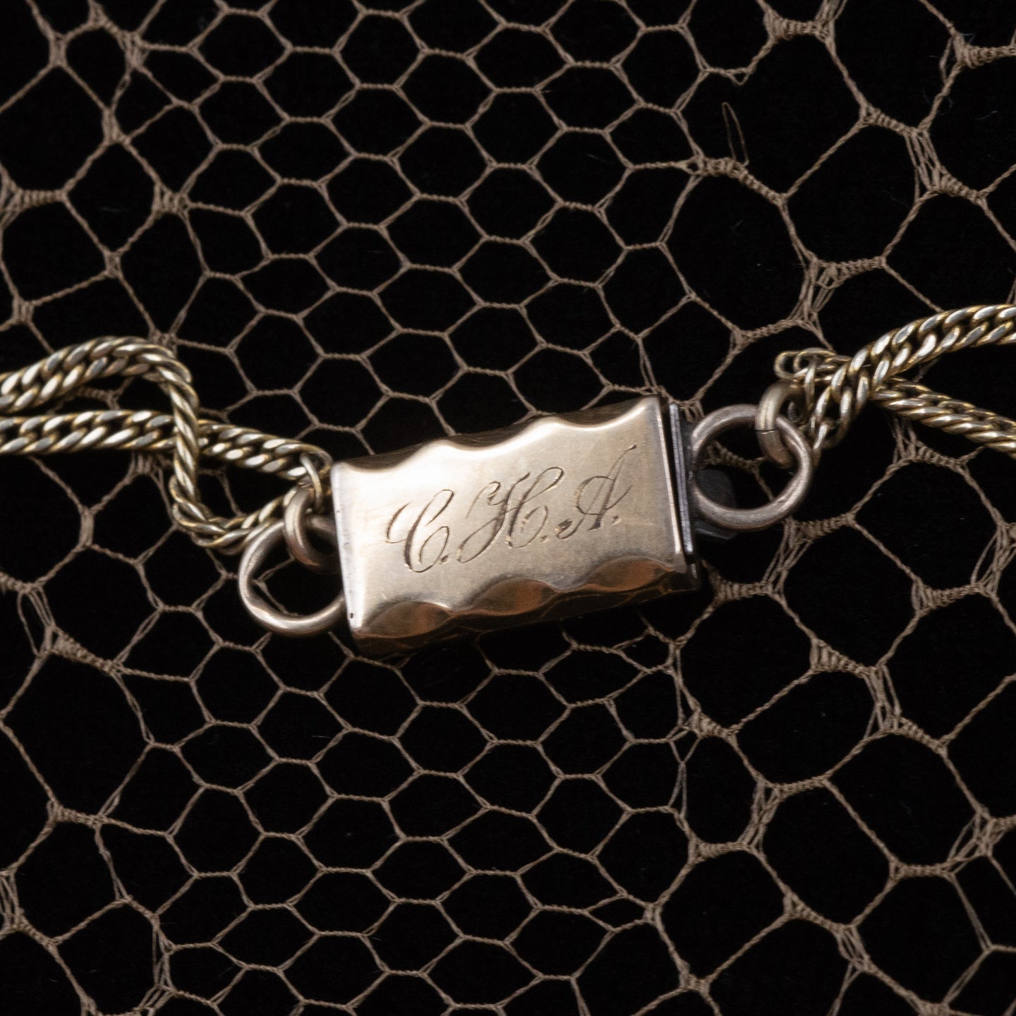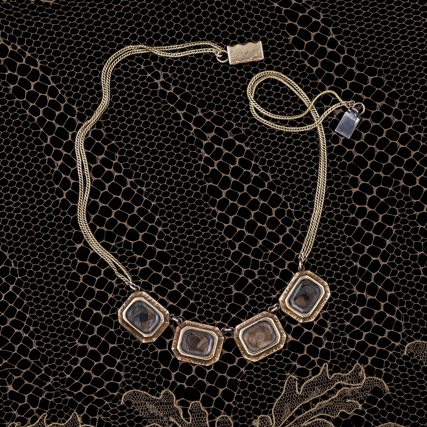 Victorian memorial jewelry is among the most enjoyable to collect for some antique jewelry lovers because of their emotional depth, symbolism and craftsmanship. This sentimental necklace features an intricate weaving of hair work in 4 dangling panels. The panels have cut-corners and they boast gorgeous engraving on their delicate frames, all secured within a sturdy glass sheet, protecting this precious life memento for decades to come. The 4 panels dangle side by side from a double chain that meets at the back. It is engraved 'CHA' at the reverse of the push-lock clasp, likely denoting the person being commemorated in this special piece. A beautiful keepsake of love and remembrance!