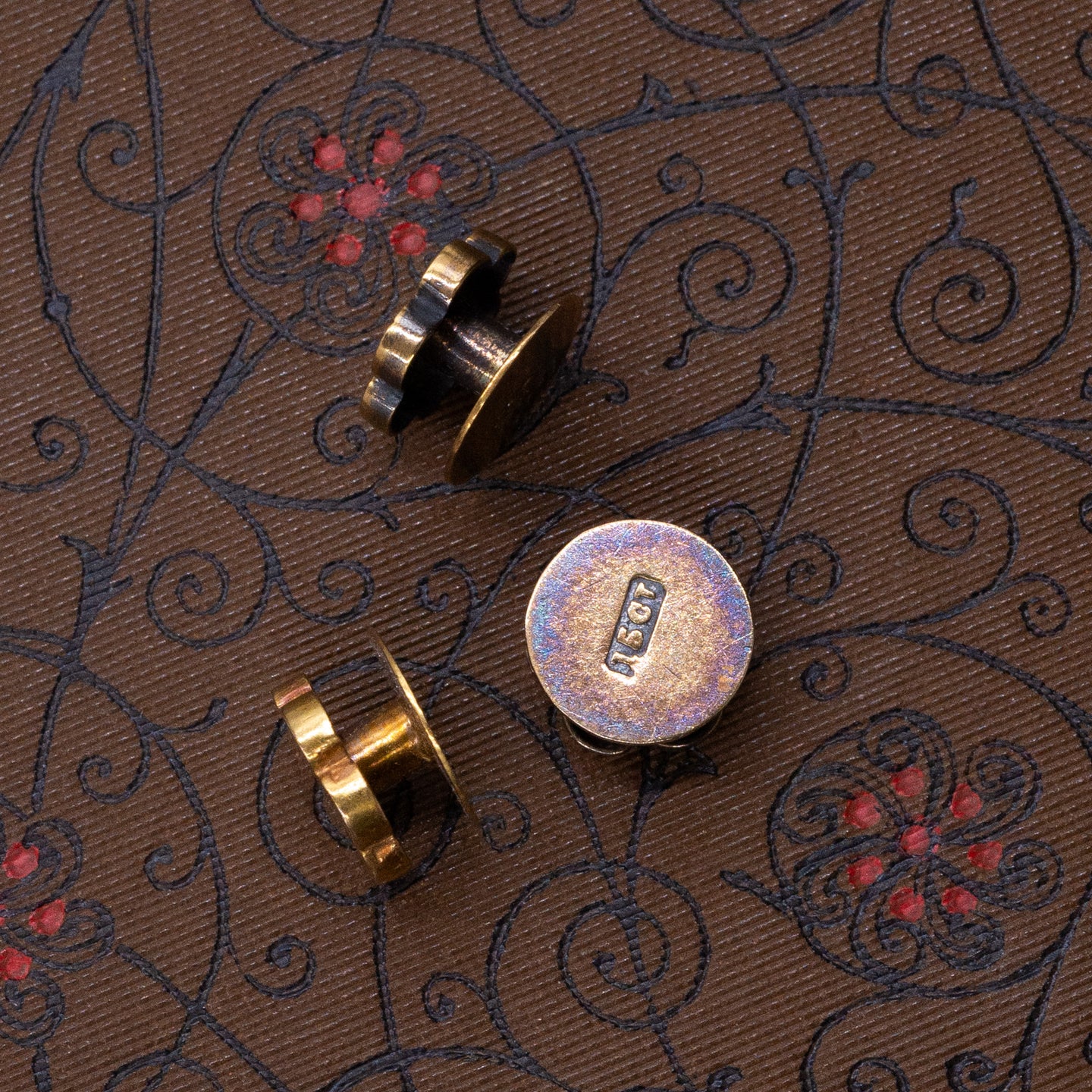 For the formal gents: a set of simple yet stunning Victorian gold shirt studs for dress shirts! This handsome set adds a touch of antique elegance to a tuxedo shirt, gracing a classic look with personal style. Each round, scallop-edged stud is etched with a shining ivy leaf against a beautifully textured background. A beloved motif in the Victorian era, the ivy leaf is an enduring symbol of strength and lasting bonds. This remarkable set is complete with its original elegantly-shaped box, presenting the studs with the sophistication and care they deserve, and making them the perfect gift for a classy gent!
