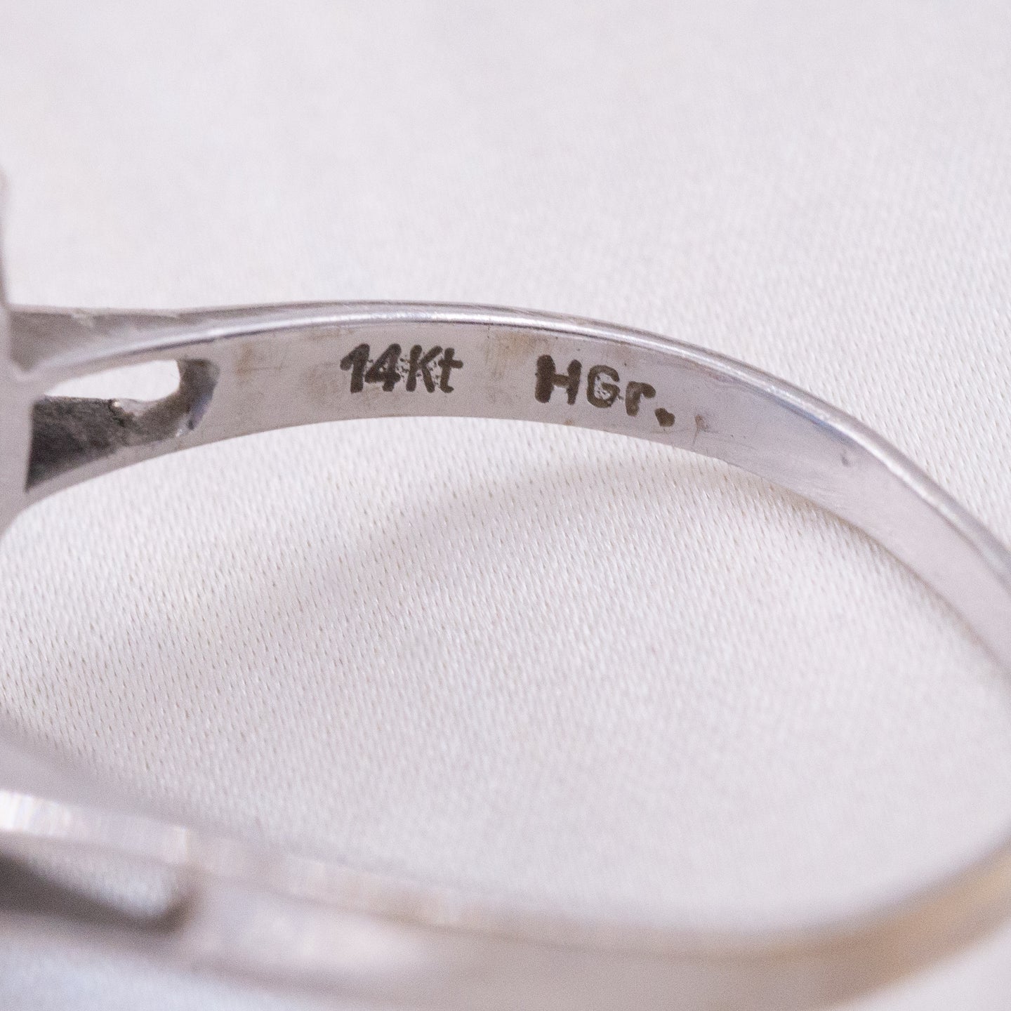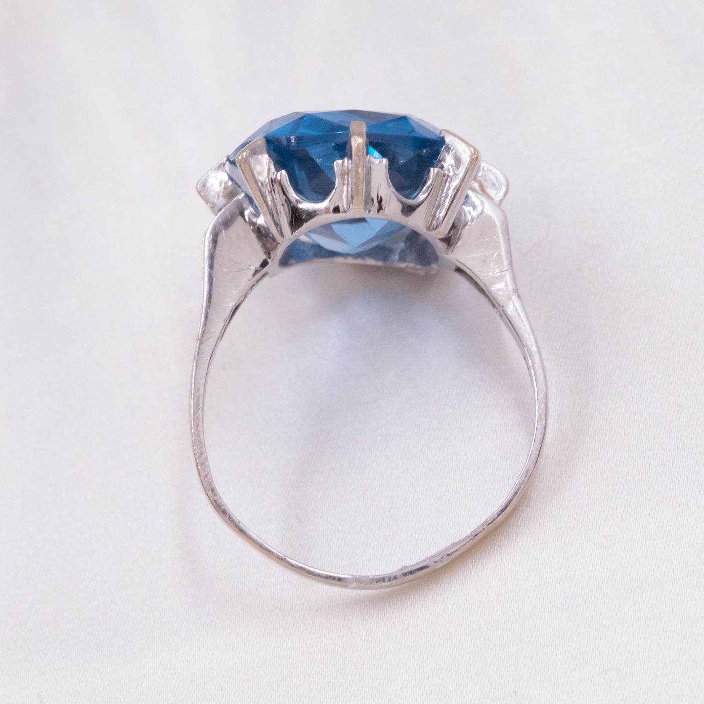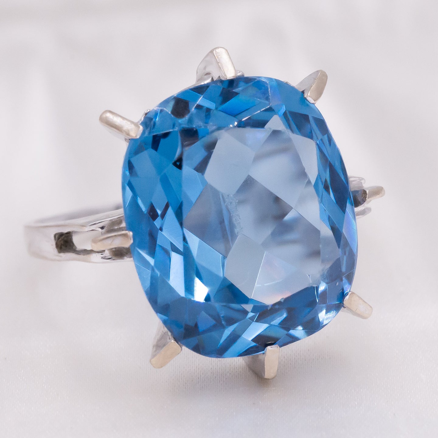 A twelve carat cerulean blue topaz takes centerstage in this glitzy mid-century cocktail ring! The dazzling gem is artfully cut by hand, with a combination of large, visible facets that decrease in size as they reach its thick girdle, adding intrigue and enhancing its unique glittering pattern. The captivating gem is set in eight angular prongs crafted in bright 14k white gold. Their tops extend outward like small, sleek rays radiating around the stone, accentuating its brilliance. This timeless cocktail ring is sure to make an elegant statement and a unique addition to any jewelry collection!