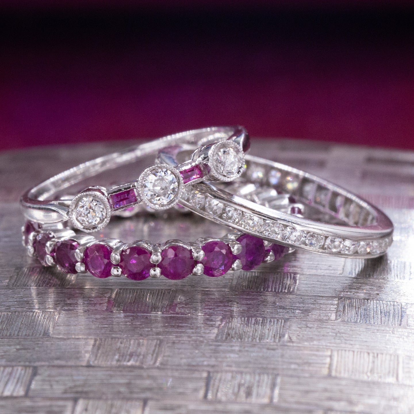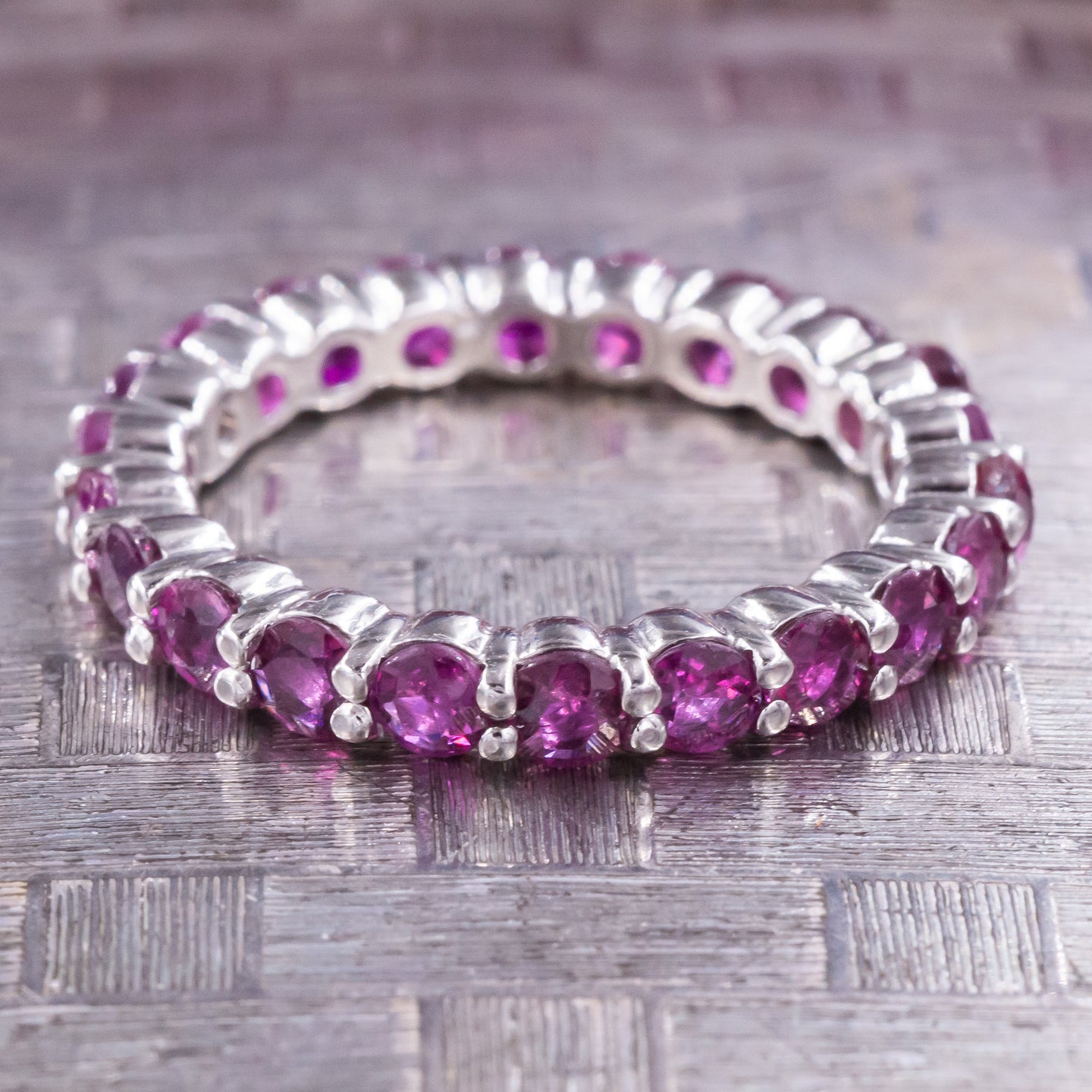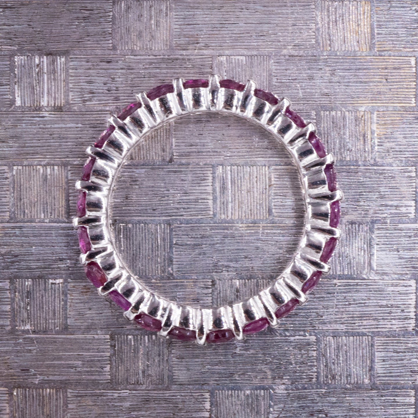 Vivid, raspberry red rubies sparkle side by side in a single, endless row in this radiant eternity band! The rubies' vibrant hue magnificently stands out against their bright white gold setting. Each is cut round and set within four prongs shared with the rubies on either side, allowing their dazzling color to outshine the white gold which minimally spaces the gems. This exquisite eternity band adds the perfect pop of color to a wedding ring set or ring stack and is so lovely to wear all on its own!