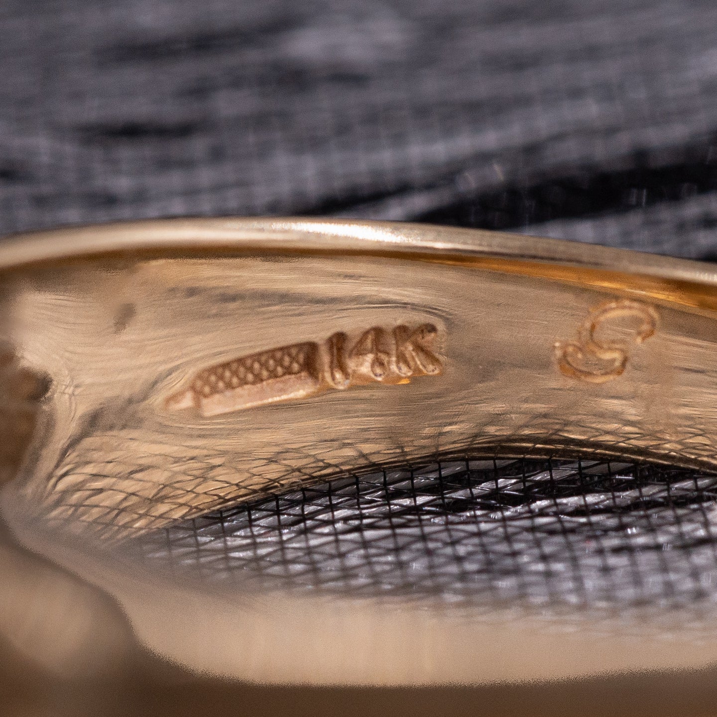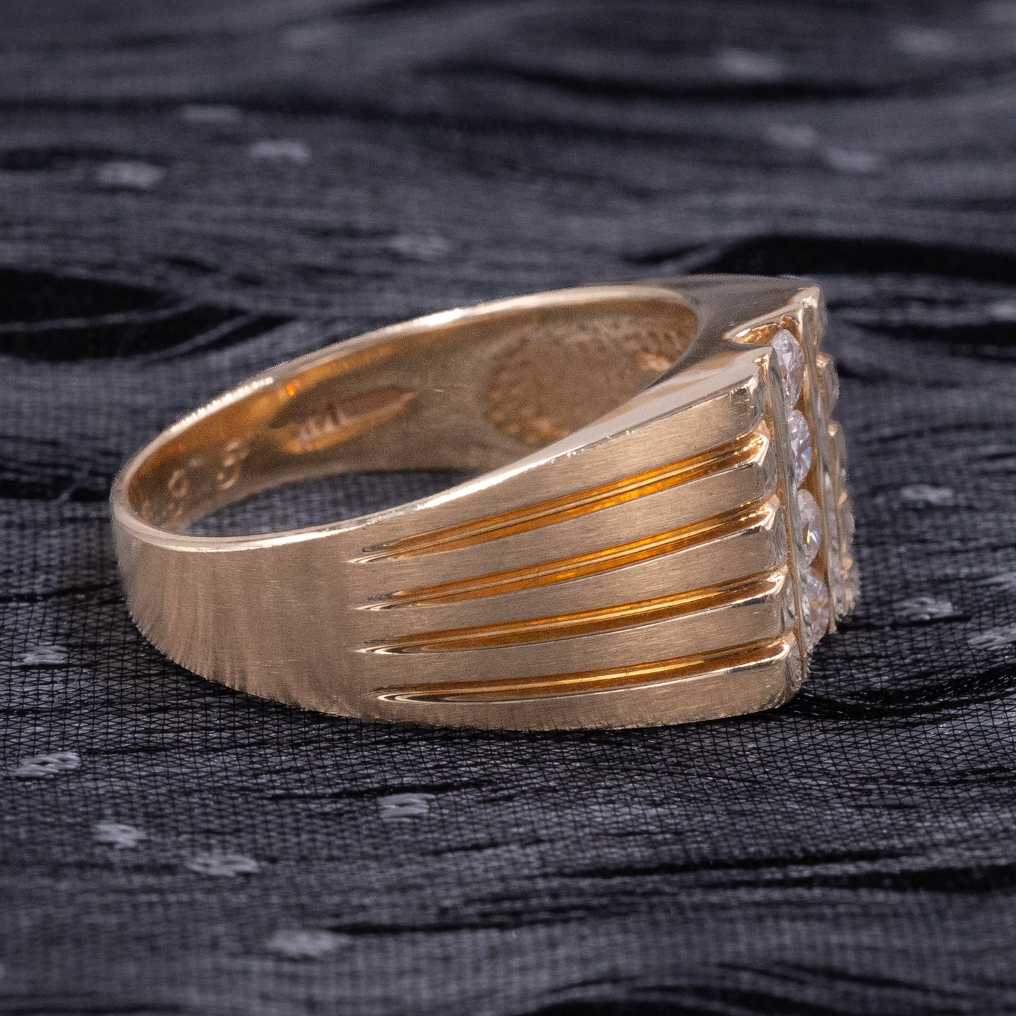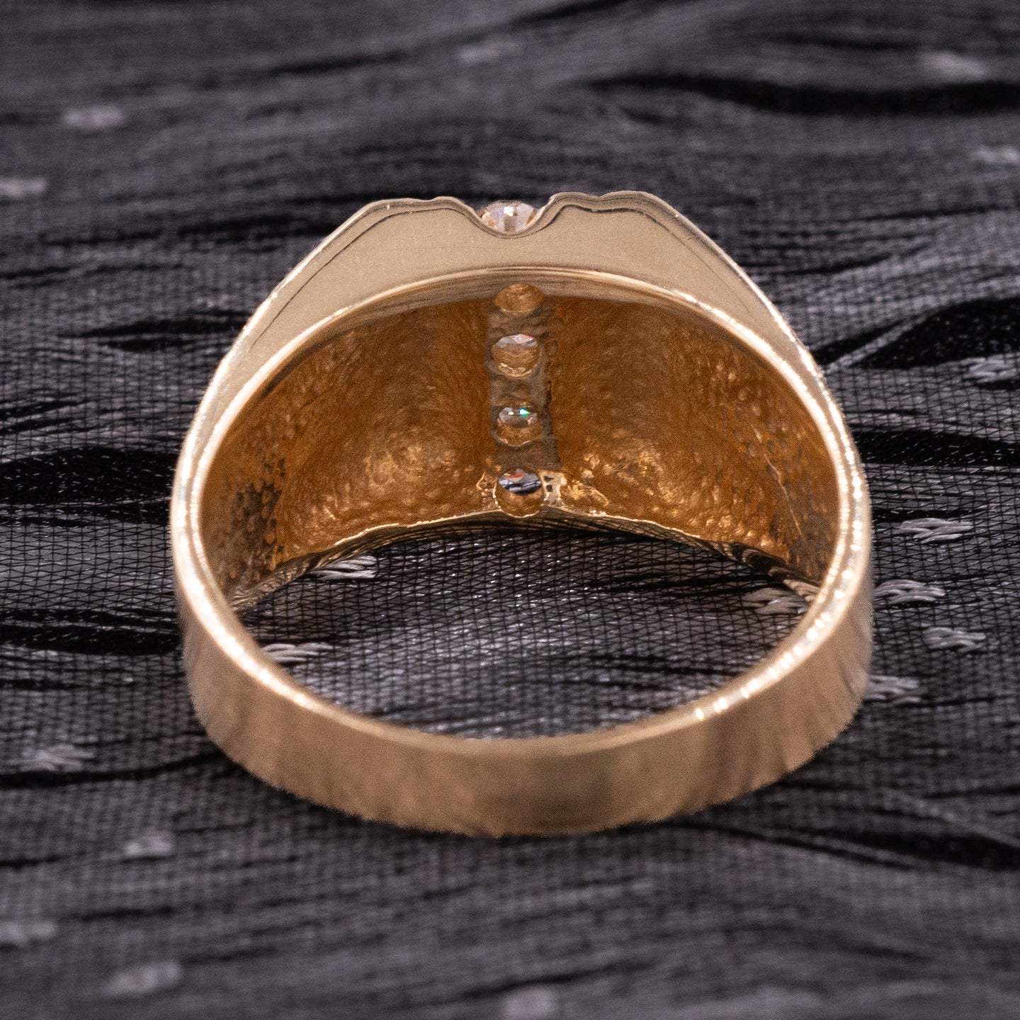 Four brilliant diamonds stack in a sleek vertical channel at the center of this bold 1980s gent's ring! Set in rich yellow gold, this handsome ring features clean lines and symmetrical angles that create a dynamic sheen across its wide band. The top of the ring is a flat plateau where the diamonds are set between wide vertical bars. Four horizontal carved lines on either side stream over the plateau's edges, running like a gleaming waterfall over the sides of the stately ring. Originally intended for the cool and confident gentlemen of the 1980s, this commanding ring can be sized to fit just about anyone who appreciates its striking, geometric allure!