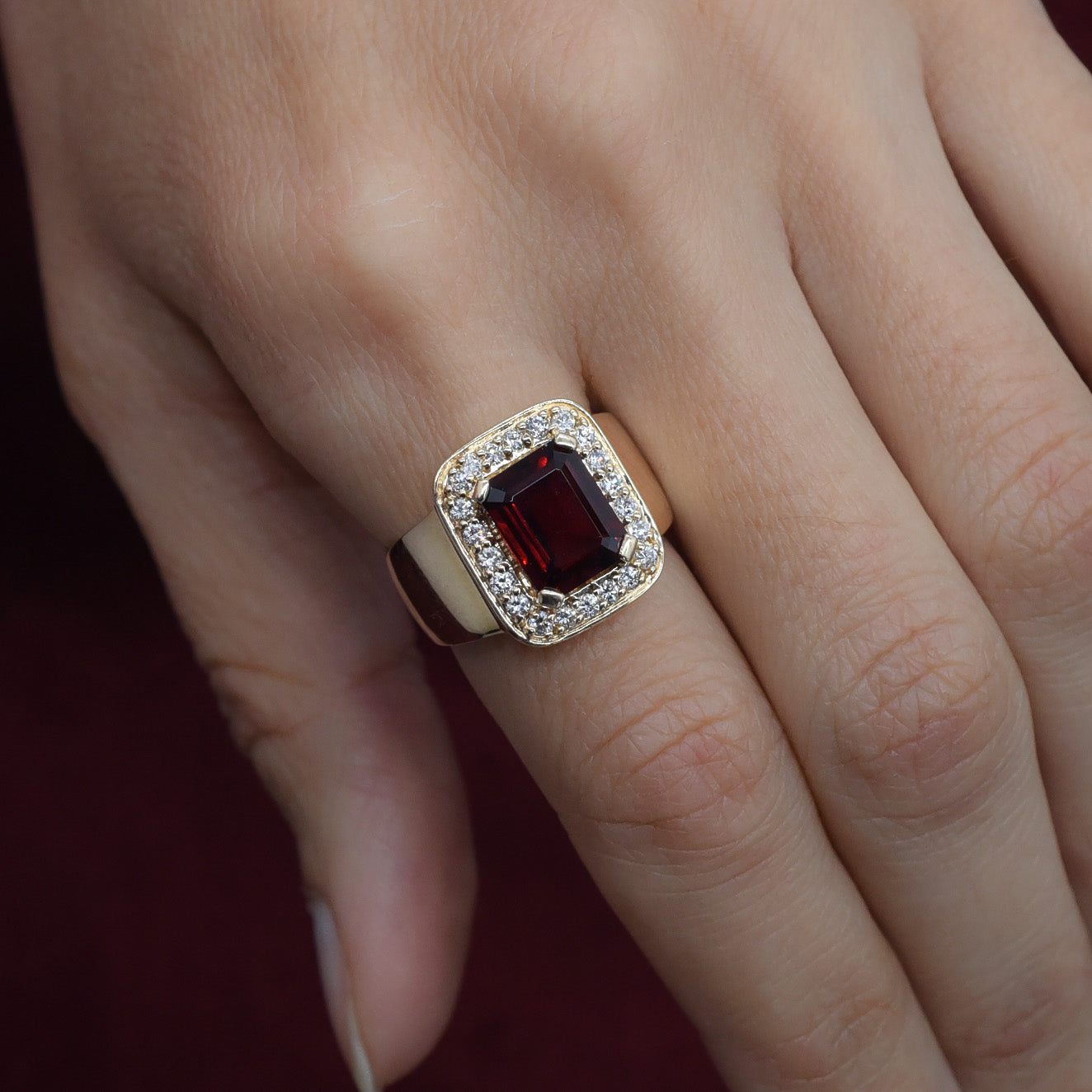 A gorgeous garnet sparkles like fine wine in a carved crystal glass, set at the center of a glittering diamond halo in this bold cocktail ring! Its intriguing deep red hue is complemented by flashes of bright red as light gleams throughout its sleek facets. The four carat garnet is emerald-cut, boasting clean lines and an open window into its glimmering beauty. Brilliant full-cut diamonds surround the stone in a radiant display, all set in a rich yellow gold bezel with soft, rounded corners that accentuate the ring's extra wide, dome-like band. Along with its flat top, the wide band gives the ring an edge associated with gent's rings. Crafted in the 1970s or 80s, this handsome ring is ready to shine on in eras to come with its next wearer!