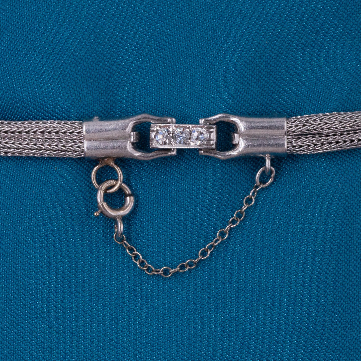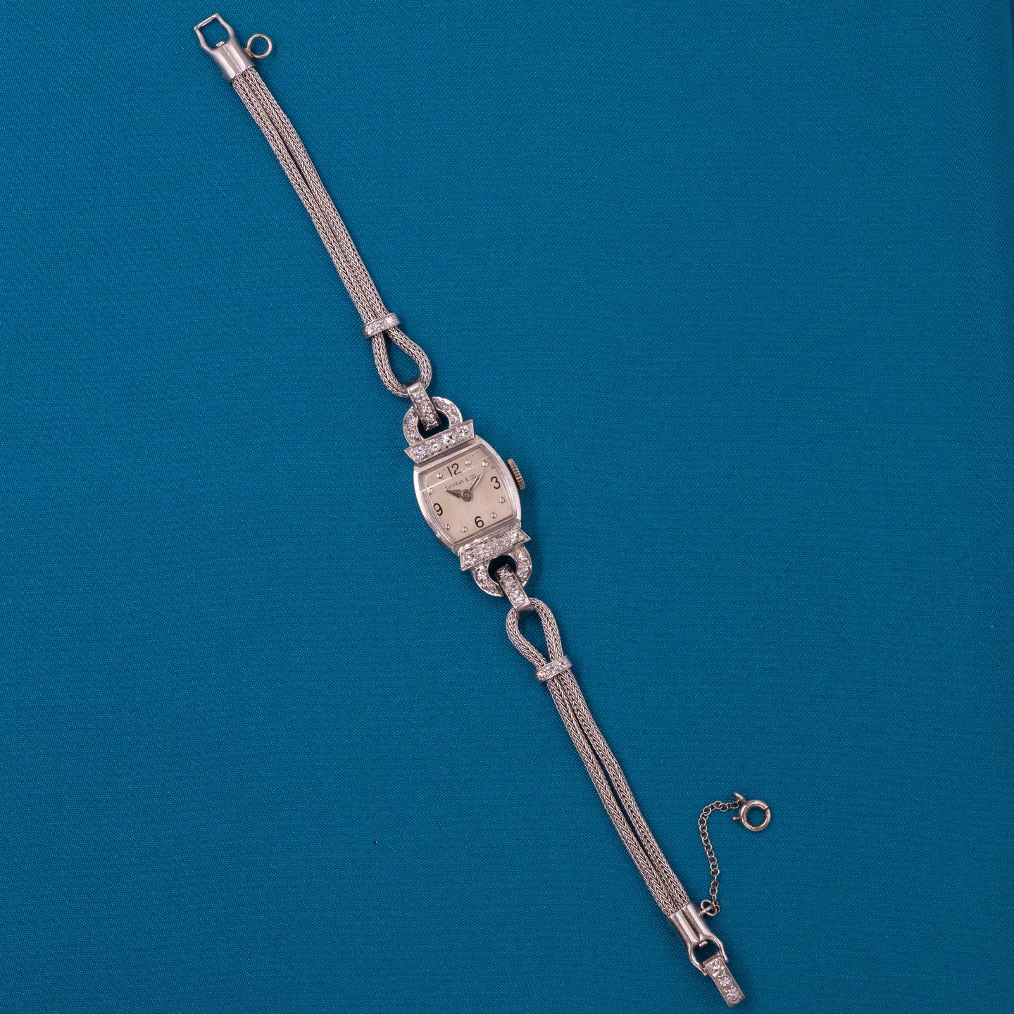 A renowned jeweler's sophisticated eye for beauty meets the mechanical precision of a renowned watchmaker in this gorgeous collaboration between Tiffany & Co. and Movado! Fashioned in the 1950s, this striking timepiece was handmade in platinum and palladium by Tiffany & Co. The finest colorless single-cut diamonds sparkle along the top and bottom borders of the watch-face, paving the case's stunning links to its strap with glamorous glitter. Satiny platinum is finely woven into a rounded wheat-style chain and doubled to create the watch's exquisite strap. Swiss watchmaker Movado contributes its 17 jewel mechanical movement, adding practicality to this precious piece of jewelry. This elegant timepiece adds a whole layer of meaning to "having a beautiful time'!