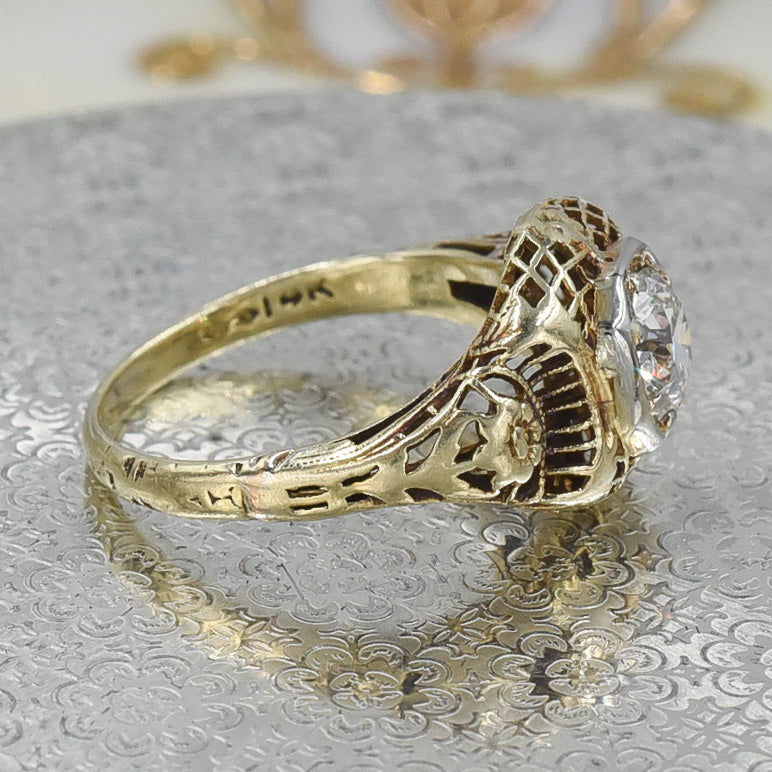 Like a glittering pond at the center of a golden garden, a transitional cut diamond sparkles within fine filigree adorned with flowers in full bloom! This romantic ring dates to around 1930, beautifully combining the architectural, intricate metal work popular in the 1920s with the warm gold tones favored in the 1930s. The filigree evokes dreamy garden lattices surrounding the stone in dynamic domes and arches as carved flowers climb up either side of the band, their leaves elegantly decorating the shank as the flowers bloom on either shoulder. The fiery transitional cut diamond shines in an octagonal handmade platinum bezel, enhancing its near colorless brilliance. As a solitaire, this ring makes a stand-out engagement ring, both traditional and dynamic, and undoubtedly romantic with its floral details! It doesn't have to be 'the ring' to be your ring though, as pictured, it looks great as a pinky ring and can be considered for any finger– surely it will dazzle however it's worn!