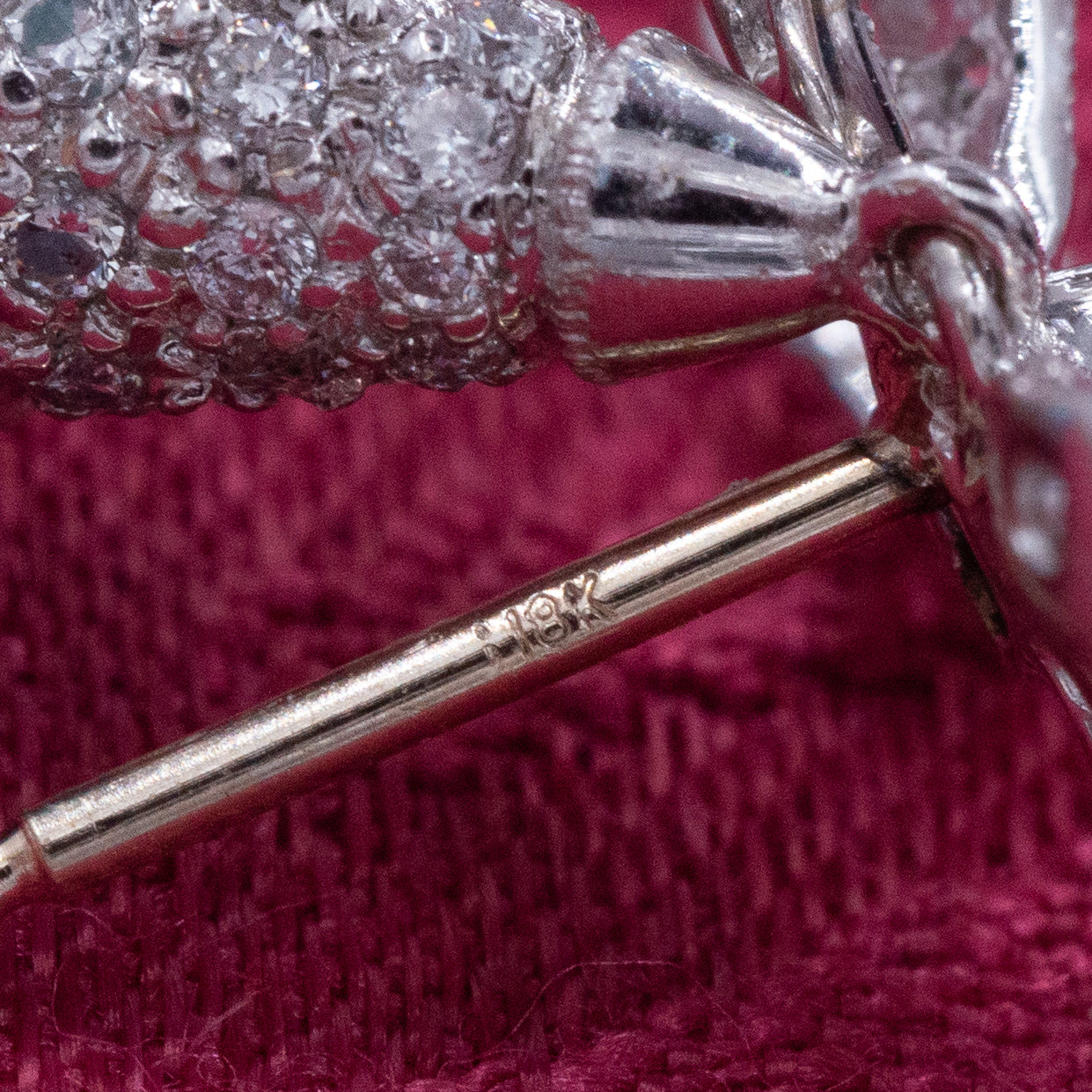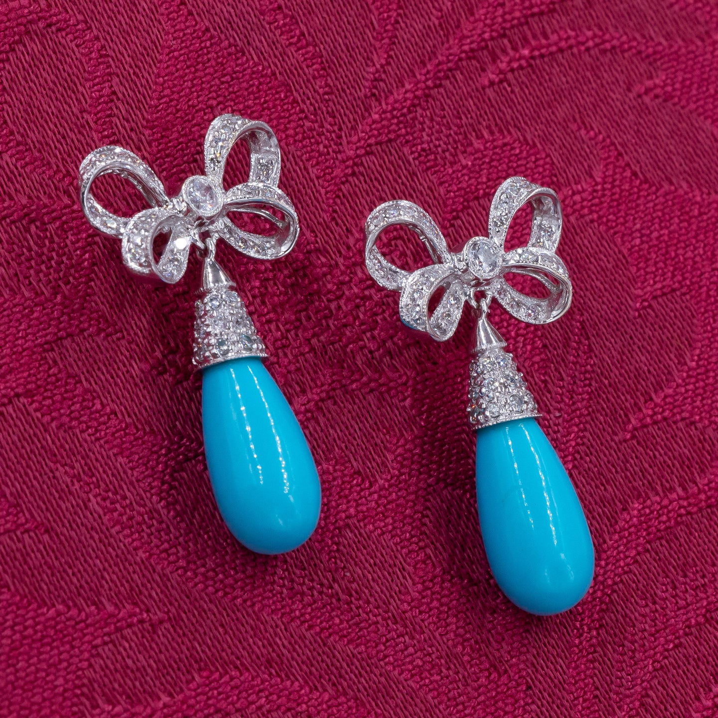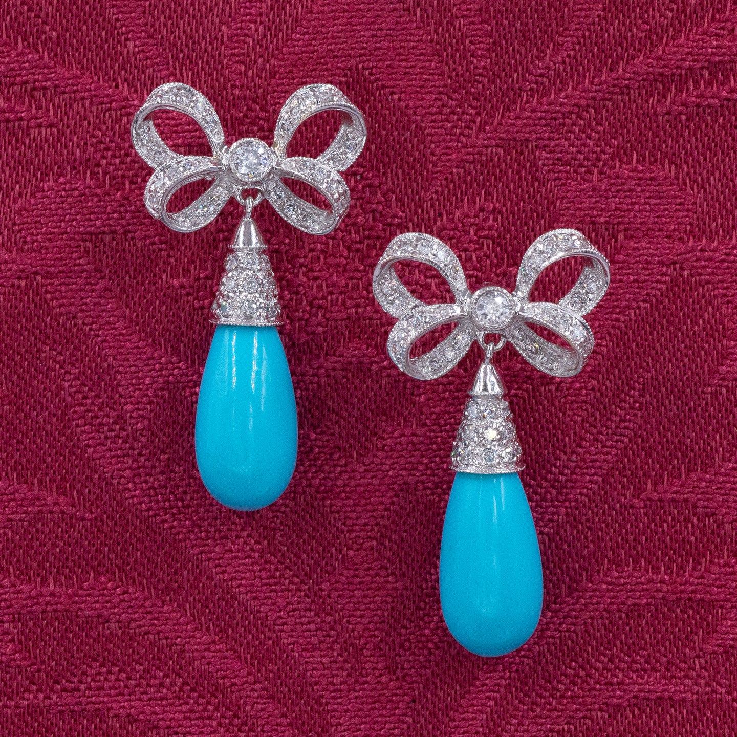 The finest Persian turquoise drops descend from glittering diamond bows in these striking earrings! Persian turquoise in known for its purity and rich, true blue hue that radiates uninterrupted by matrixing commonly found in other turquoise stones. This incredible clarity is what defines this beloved stone as a gem worthy of being set alongside diamonds in solid bright white gold. Over a carat of brilliant full-cut diamonds are pavé-set throughout the bows and along the top of the turquoise drops, with a larger bezel-set diamond sparkling in the center of each bow. These darling earrings elegantly celebrate precious blue turquoise gems, topping them with the prettiest bow!