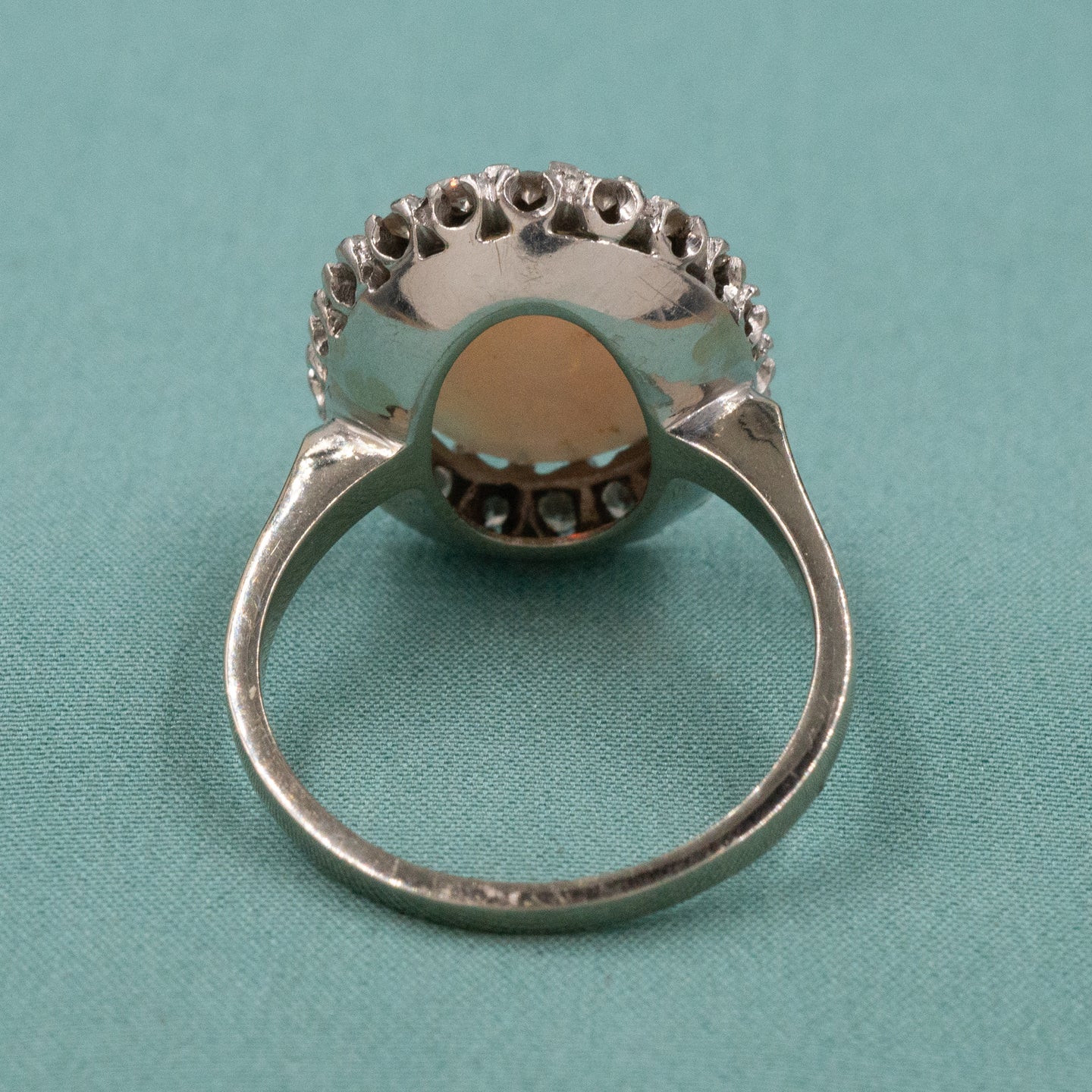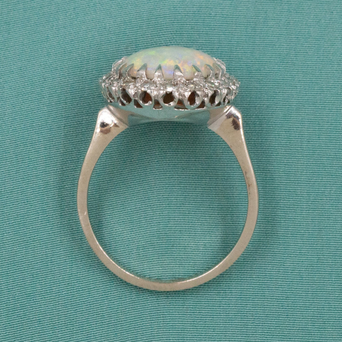 A galaxy of color surrounded by glittering, starry diamonds! This incredible 7 carat opal boasts the richest, most luminescent array of colors this gem is known for. This top-quality opal is covered in neon bursts of every color on the spectrum, flashing as it moves in the light. A single row of diamonds encircles the opal with a fiery halo, completing this magnificent cocktail ring in bright white gold. This alluring ring is endlessly fascinating and certain to captivate all who gaze upon its vibrant hues!