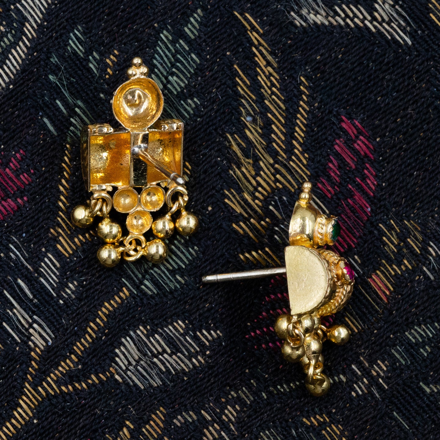Drawing inspiration from Etruscan-era jewelry but made in the 1980s, this striking pair of earrings feature bezel-set vibrant emeralds and rubies, all set in gleaming yellow gold, with hand-applied details abound. Rope chains border the half-moon columns on each side of the earring, with little bits of granulation and flowing golden spheres below. Their beautifully textured surface and sweet details ensure this will be a stand-out pair of earrings in your jewelry collection! An incredible example of Etruscan Revival jewelry!